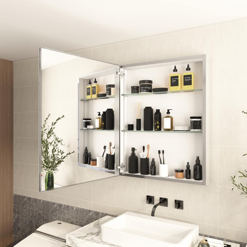 Upgrade your bathroom with the sleek and functional FORCLOVER 24 in. x 30 in. Silver Aluminum Medicine Cabinet. Featuring a sophisticated copper-free silver mirror and adjustable tempered glass shelves, this cabinet ensures organized and clutter-free storage. Its soft-closing hinges provide a quiet and elegant user experience.