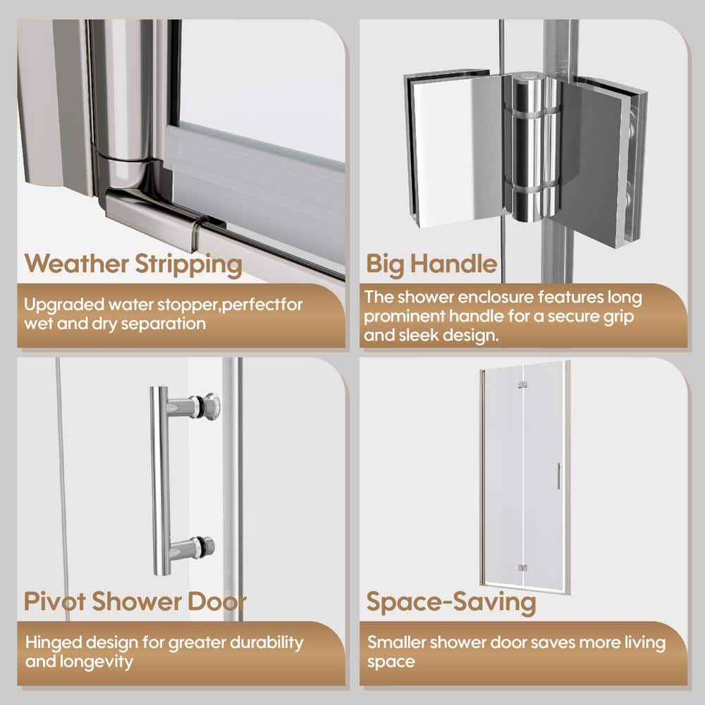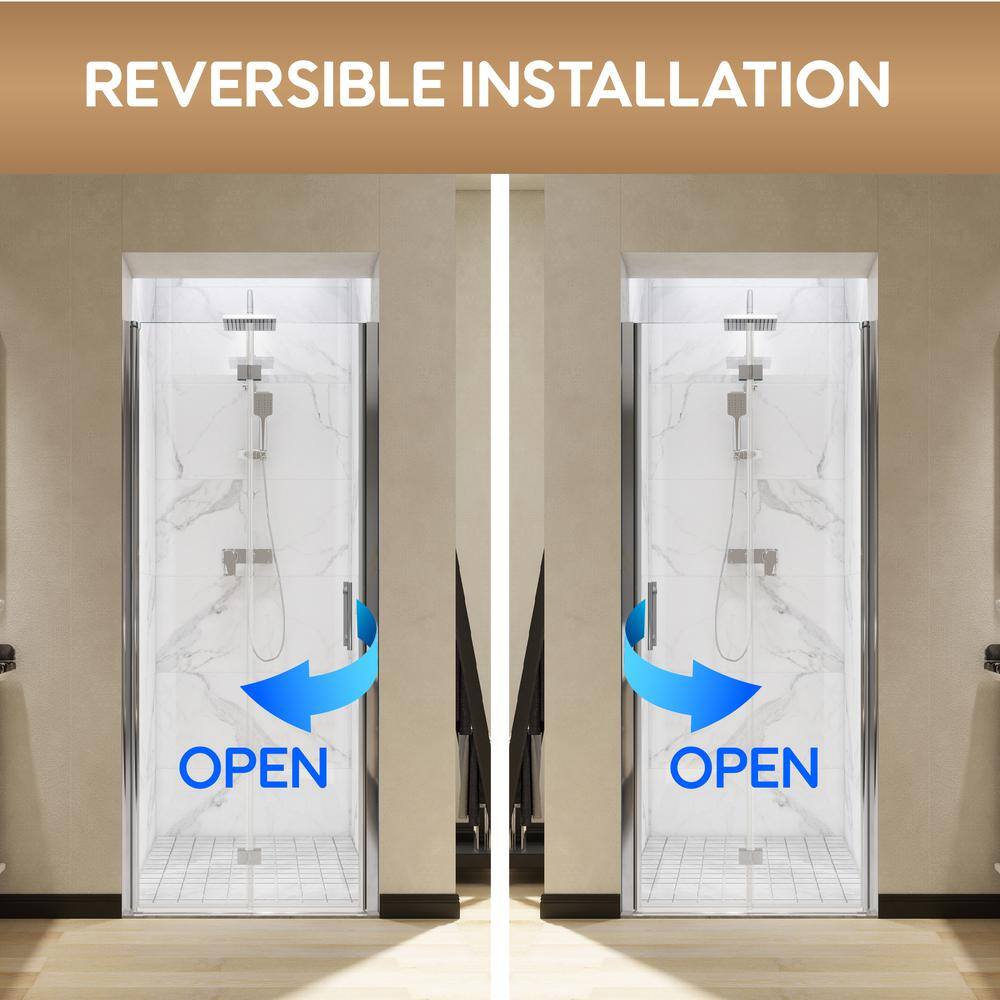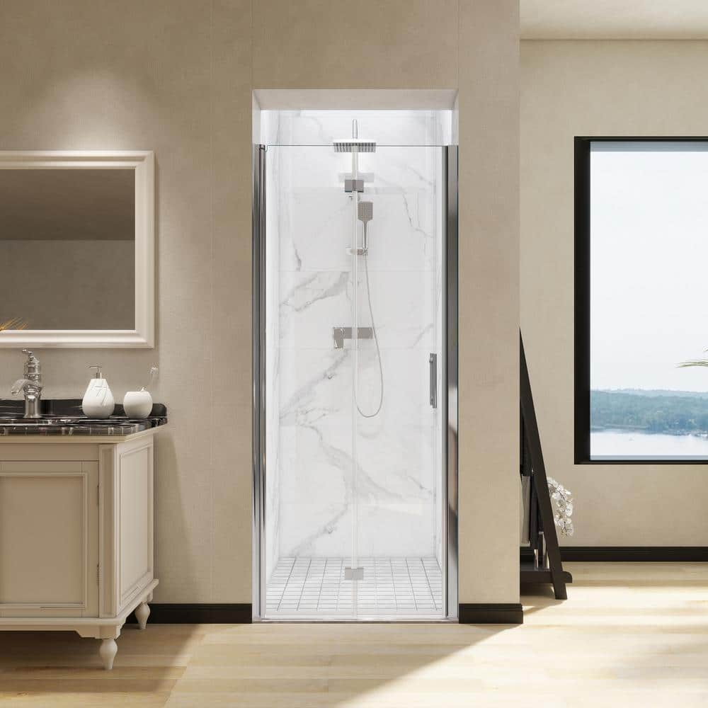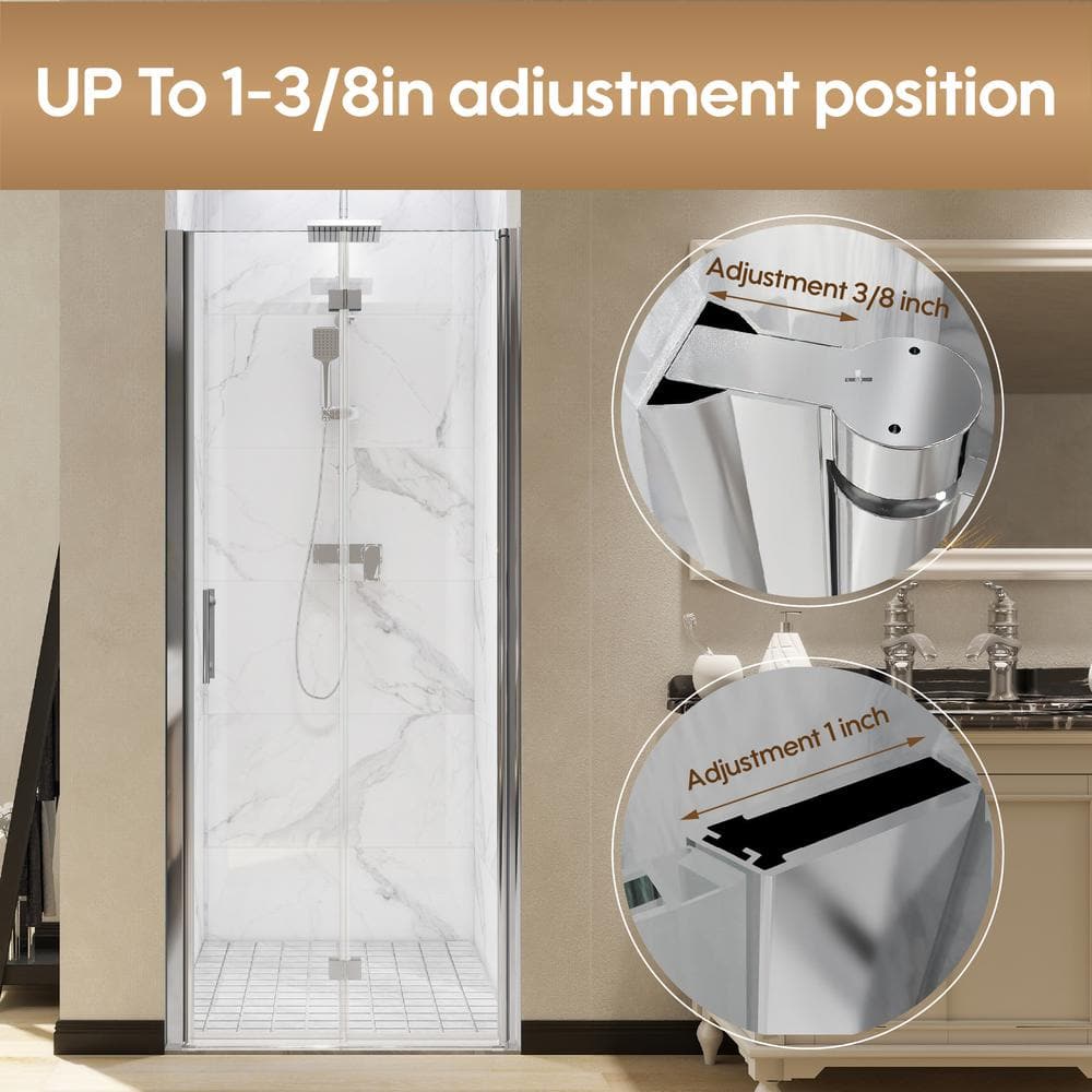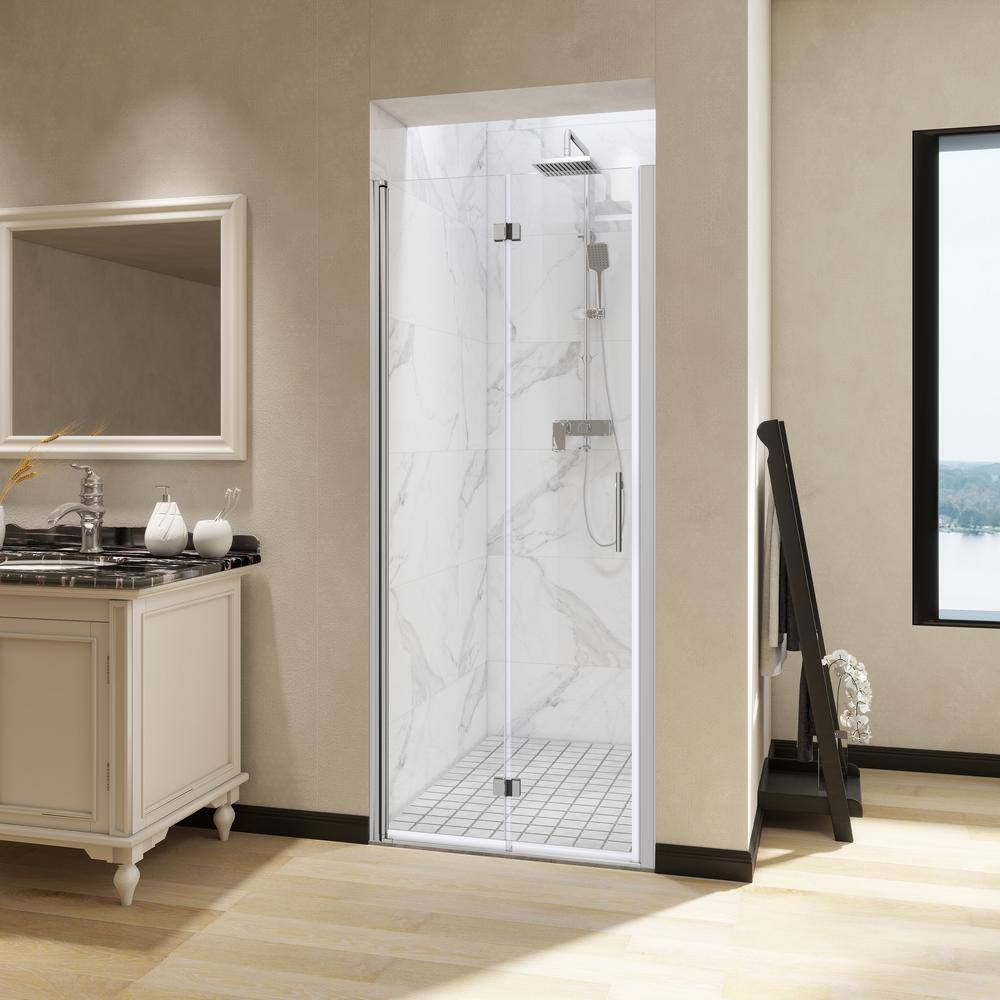 Upgrade your bathroom with the FORCLOVER Frameless Bi-Fold Shower Door, designed to blend style and functionality. Featuring clear tempered glass and chrome accents, its space-saving bi-fold design pivots for a wide opening. Ideal for corner installations, it enhances both compact and large spaces with elegance.