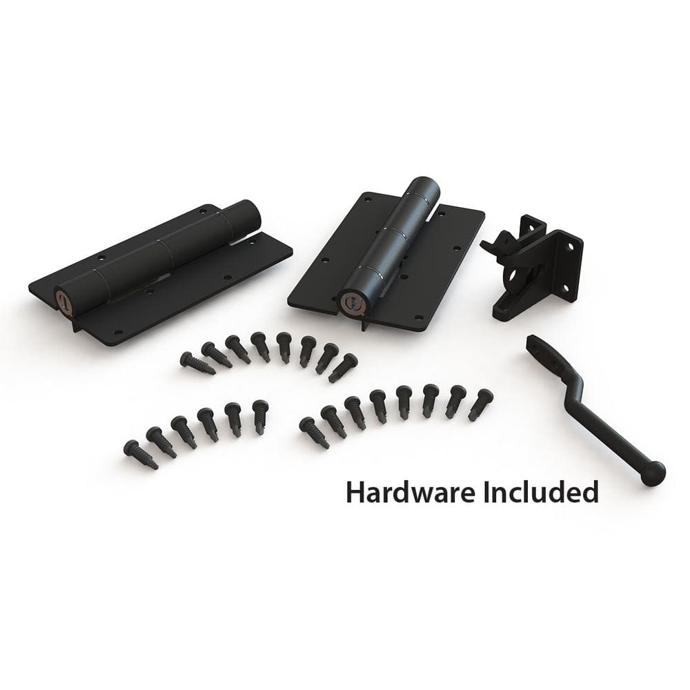 A: Yes, it includes hinges, a self-latching gravity latch, and all necessary mounting hardware for installation.