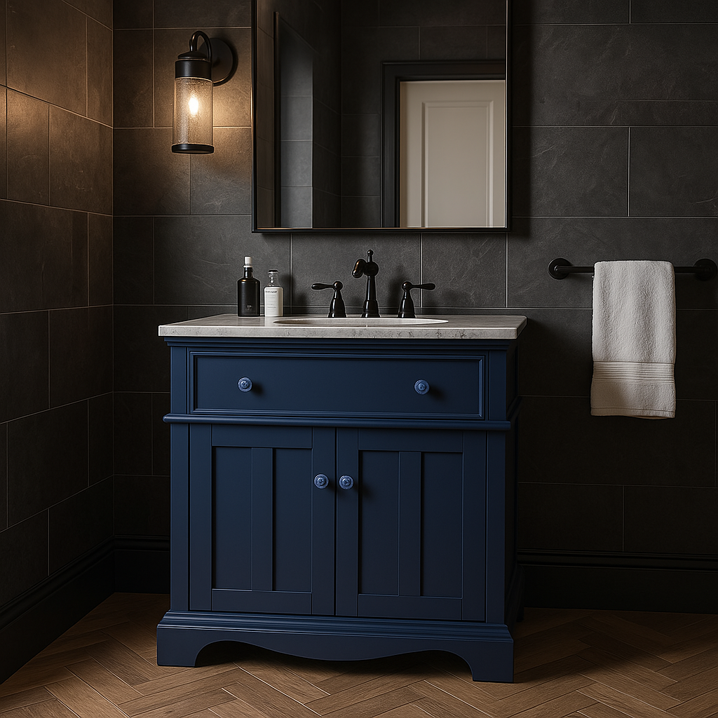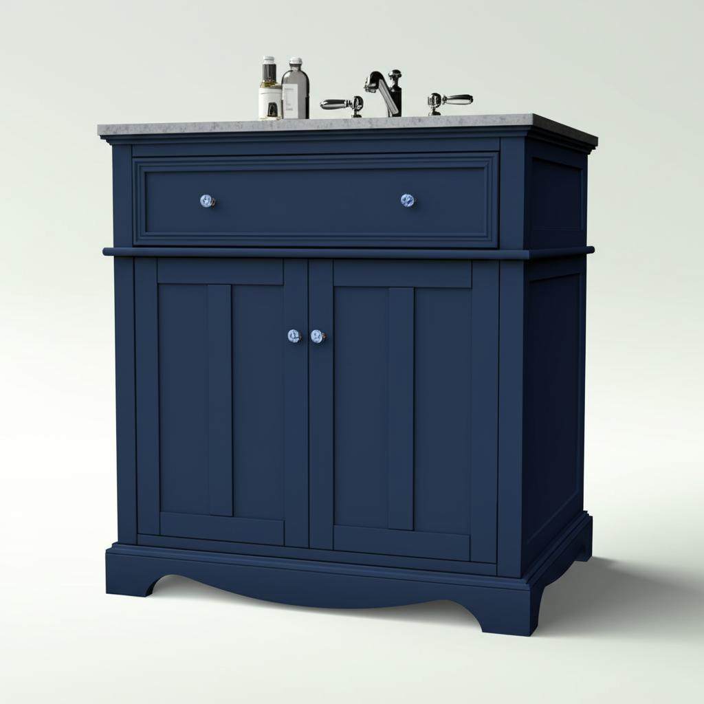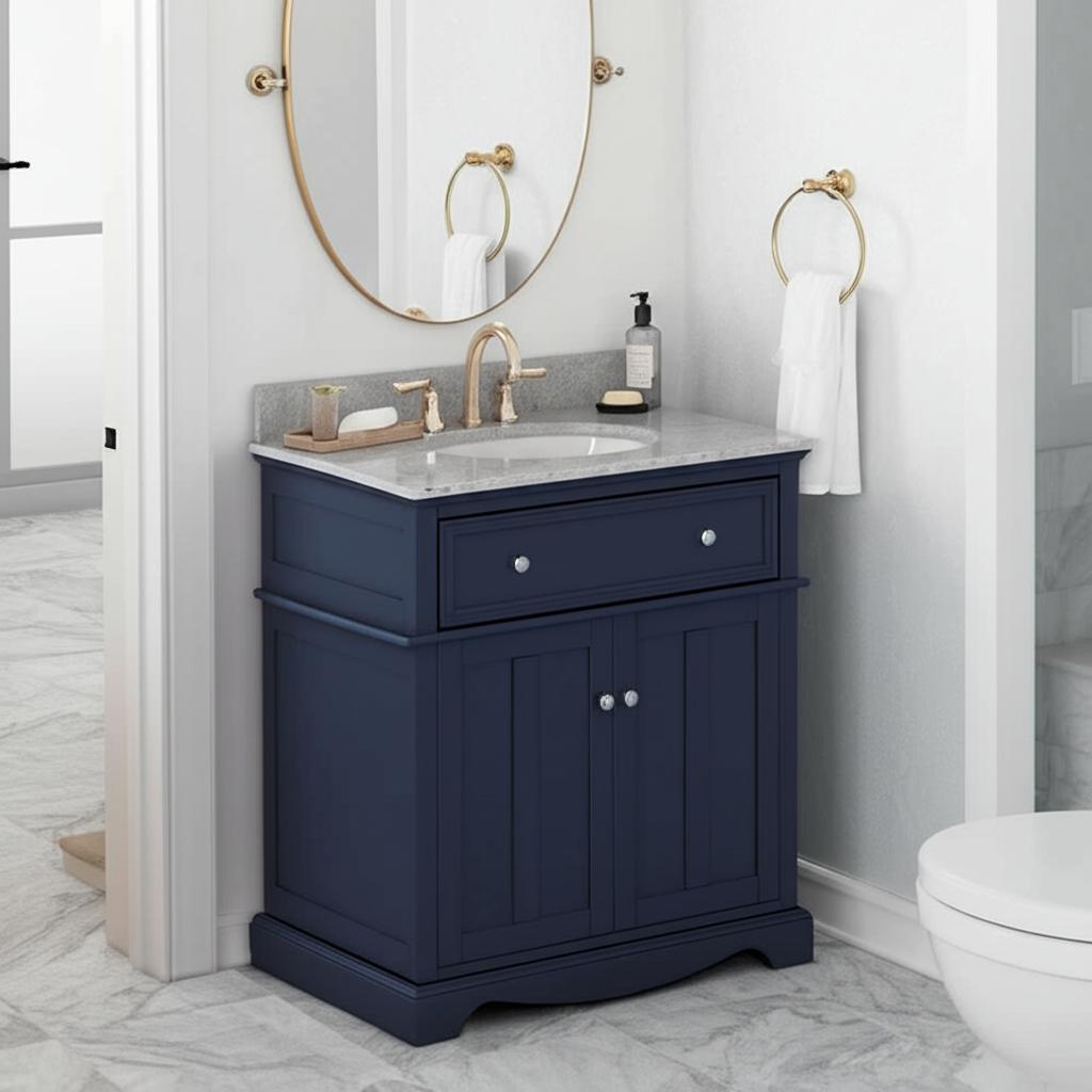 The Fremont 32-inch Navy Blue Bath Vanity is a masterpiece of design and functionality, perfect for elevating any bathroom space. Its rich navy blue finish and nickel knobs exude sophistication, while the grey granite top adds a touch of natural elegance. Style it with a pair of modern sconces and a round mirror to create a serene and luxurious retreat. This vanity is not just a fixture; it's a statement of refined taste and practical beauty.