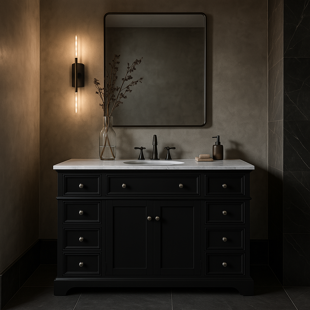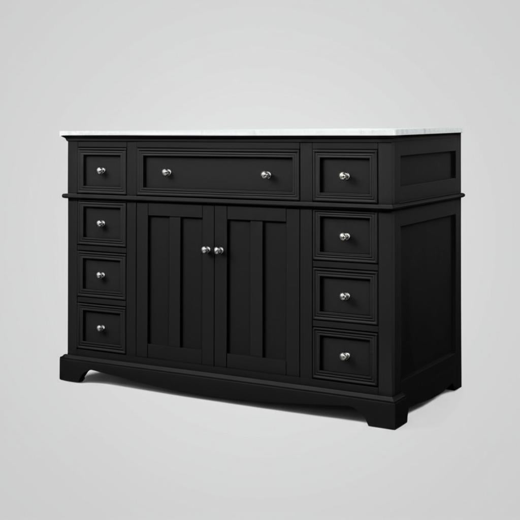 The Fremont Single Sink Vanity combines timeless design with modern functionality. Featuring a durable engineered marble top, soft-closing drawers, and a sleek black finish, this vanity is perfect for elevating your bathroom decor.
