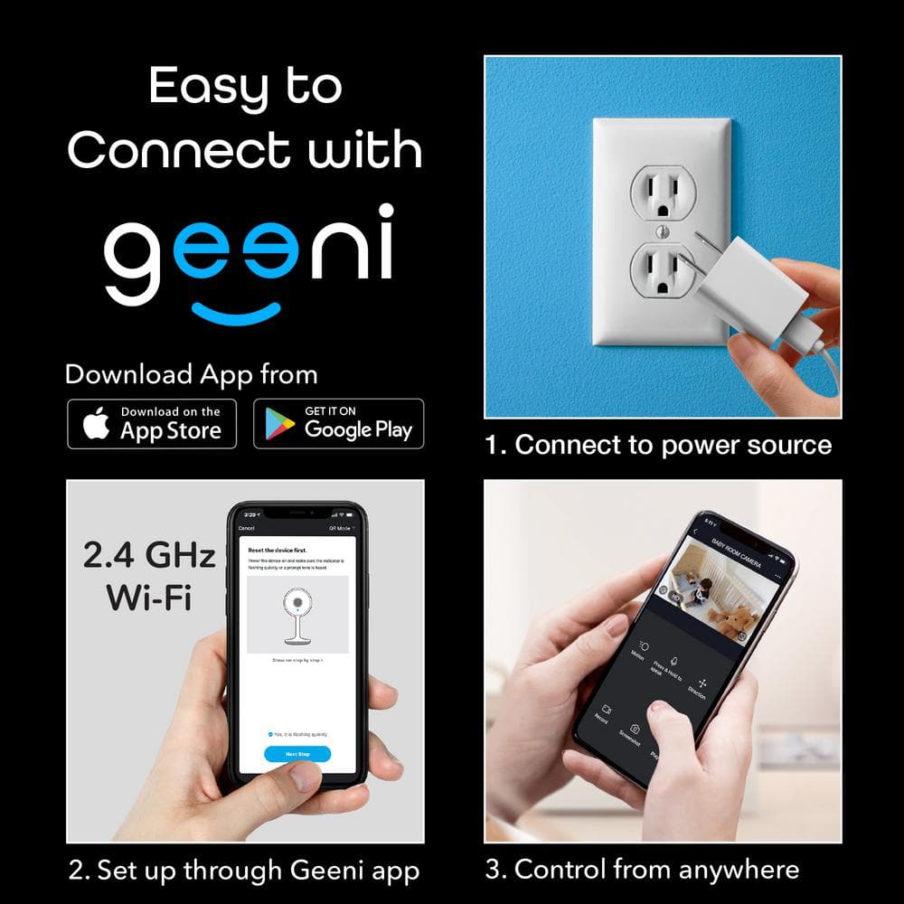A: Install by downloading the Geeni app, plugging the camera into an outlet, and connecting it to your home Wi-Fi following the in-app instructions.