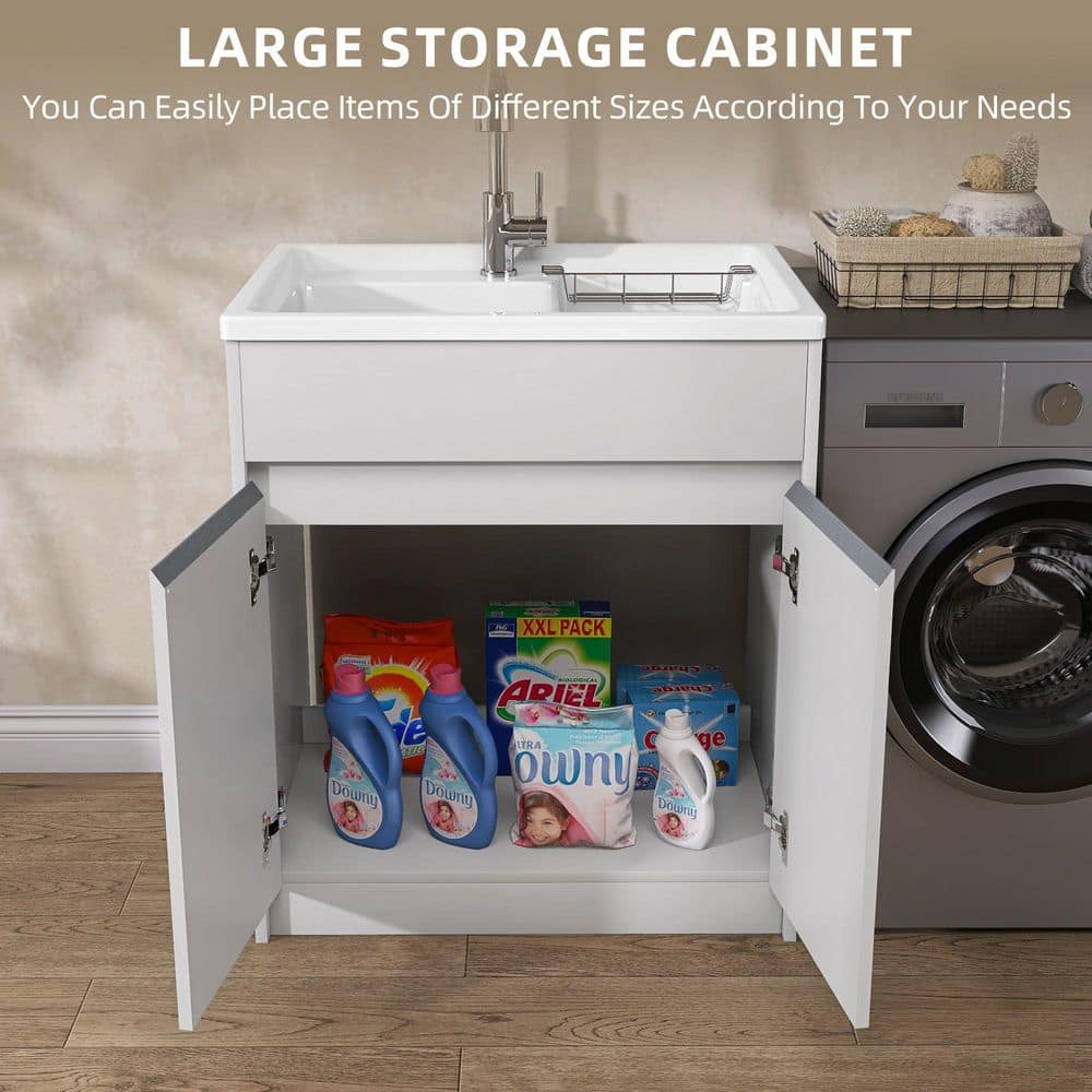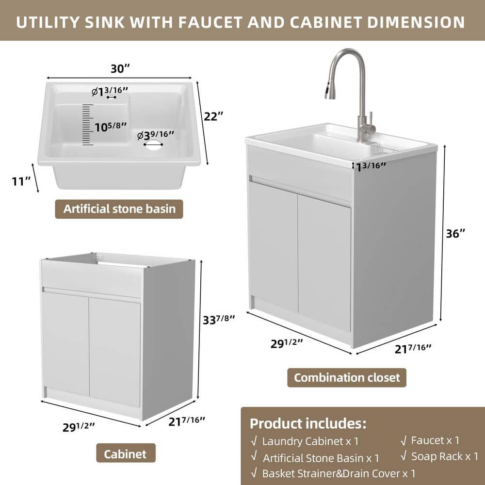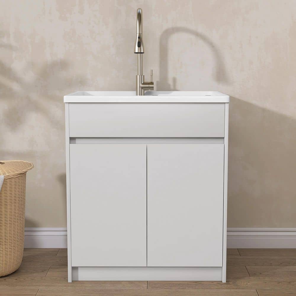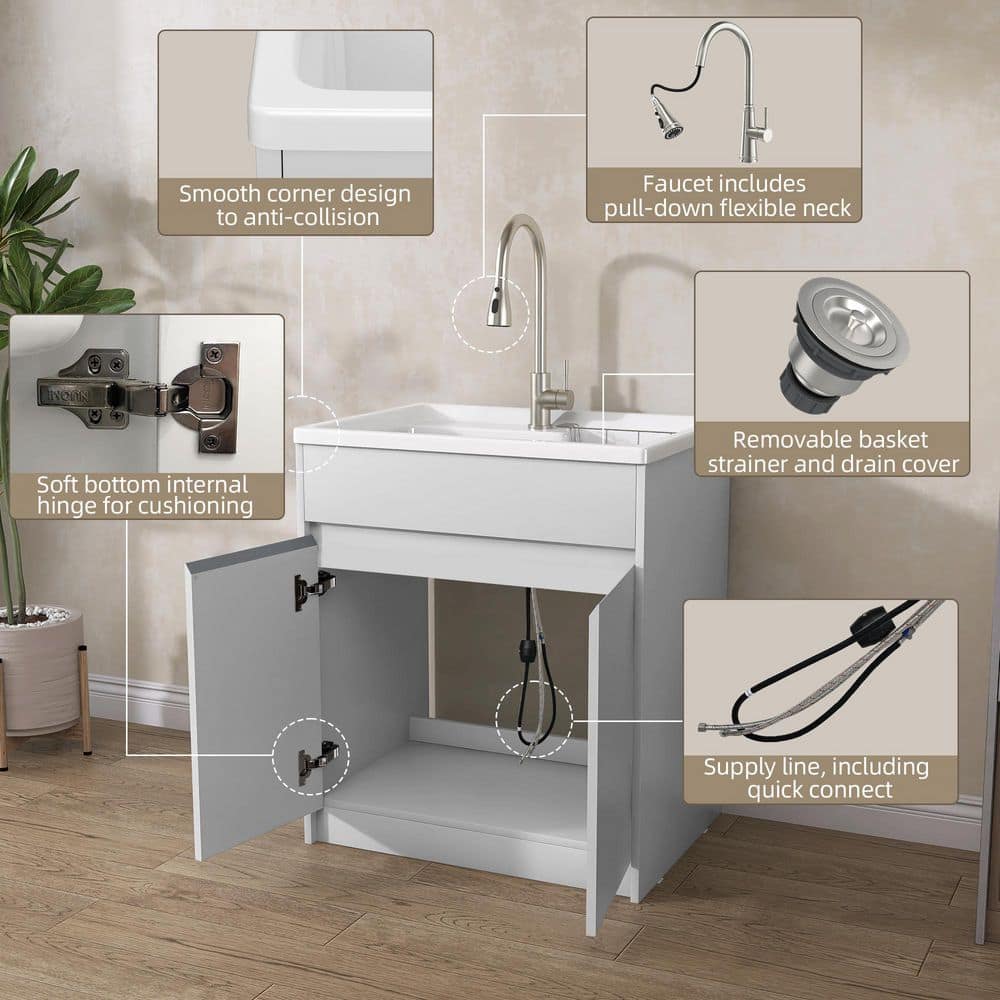 Enhance your laundry or utility space with the Getpro 30 in. Freestanding Laundry Utility Sink. Featuring a high-quality solid surface sink and a durable honeycomb aluminum cabinet, this unit offers excellent resistance to scratches, stains, and impacts. The versatile pull-out faucet and ample storage space make it perfect for both indoor and outdoor applications.