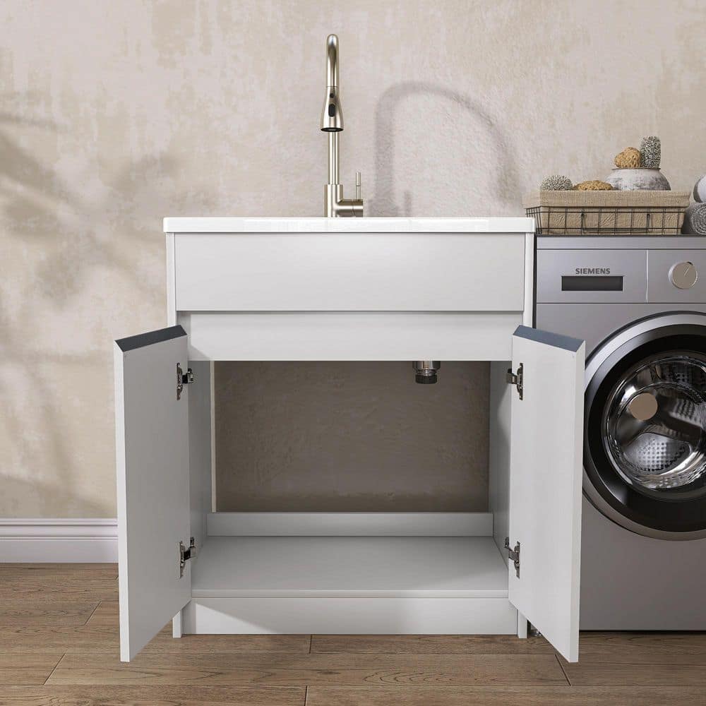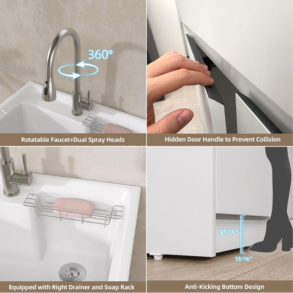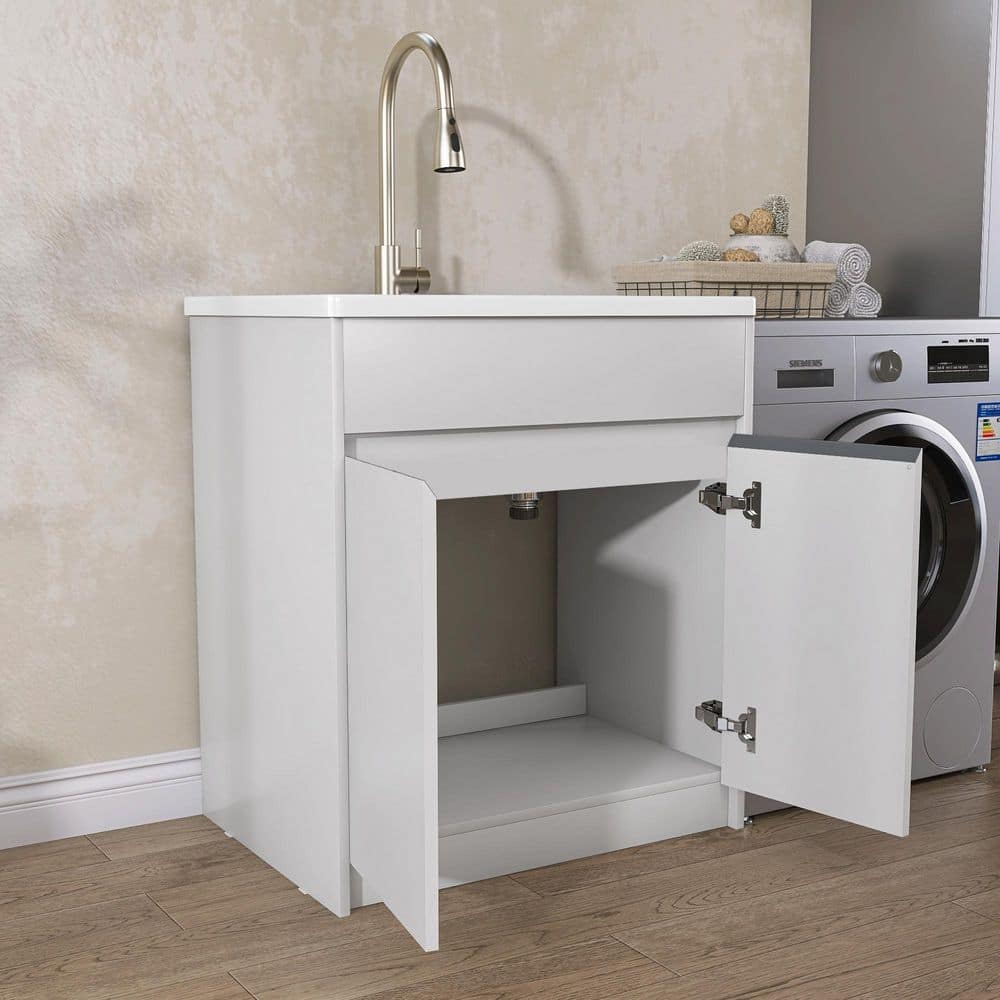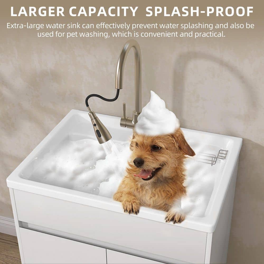 Enhance your laundry or utility space with the Getpro 30 in. Freestanding Laundry Utility Sink. Featuring a high-quality solid surface sink and a durable honeycomb aluminum cabinet, this unit offers excellent resistance to scratches, stains, and impacts. The versatile pull-out faucet and ample storage space make it perfect for both indoor and outdoor applications.
