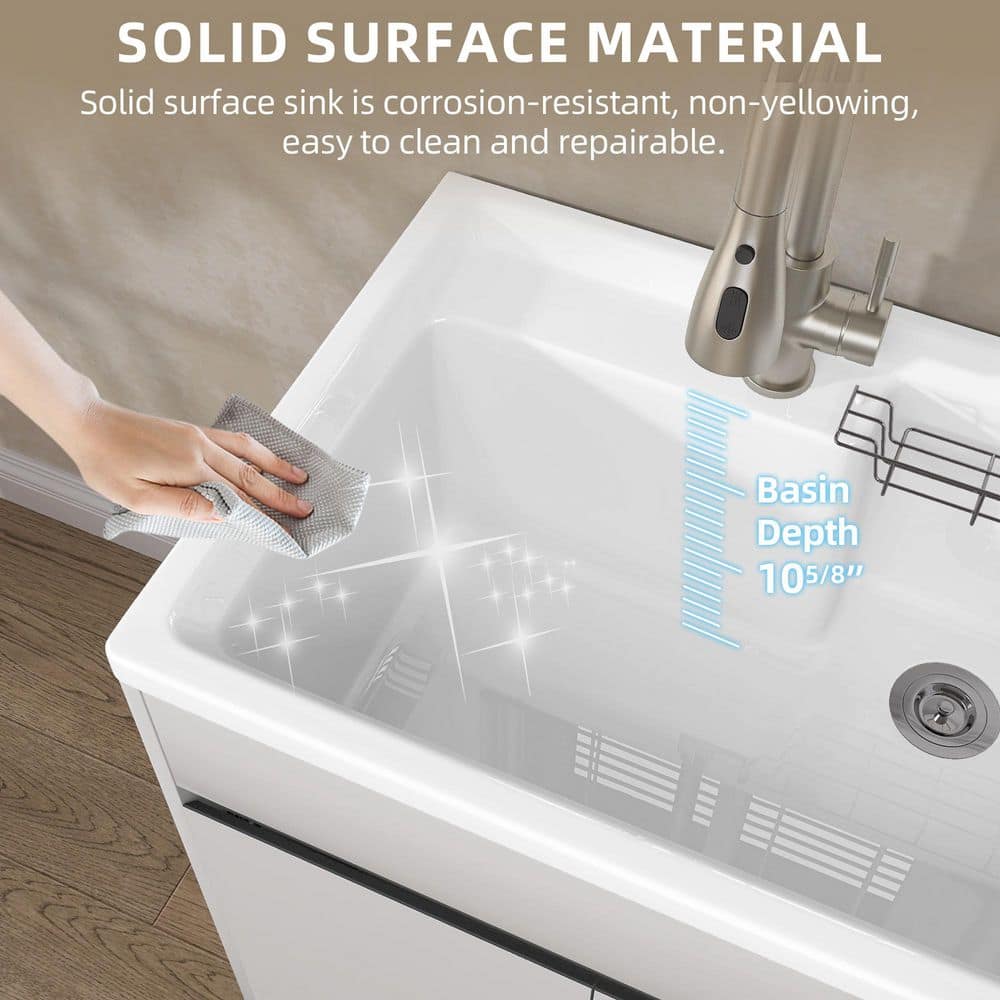 Durable and Stylish: Solid surface sink resists scratches and stains; sleek matte white cabinet.