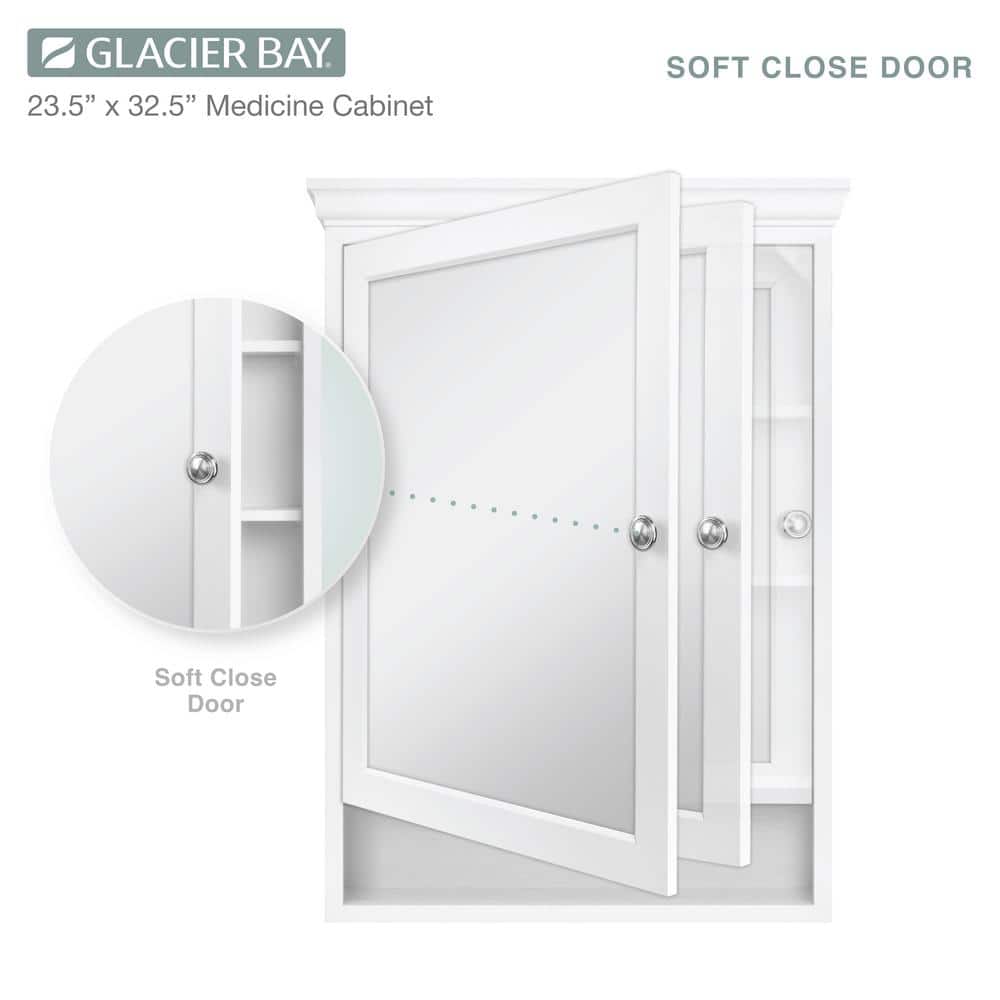 Enhance your bathroom with the Glacier Bay White Shaker Framed Surface-Mount Medicine Cabinet. It combines style and functionality with soft-close doors and versatile storage solutions, making it a perfect addition for any modern bathroom setting.