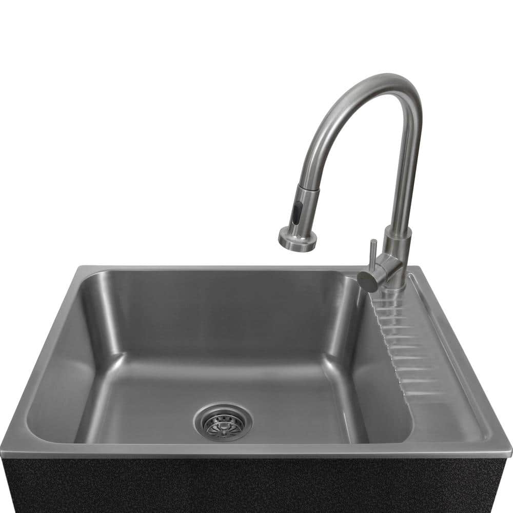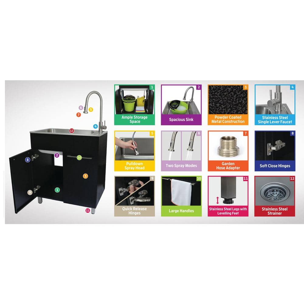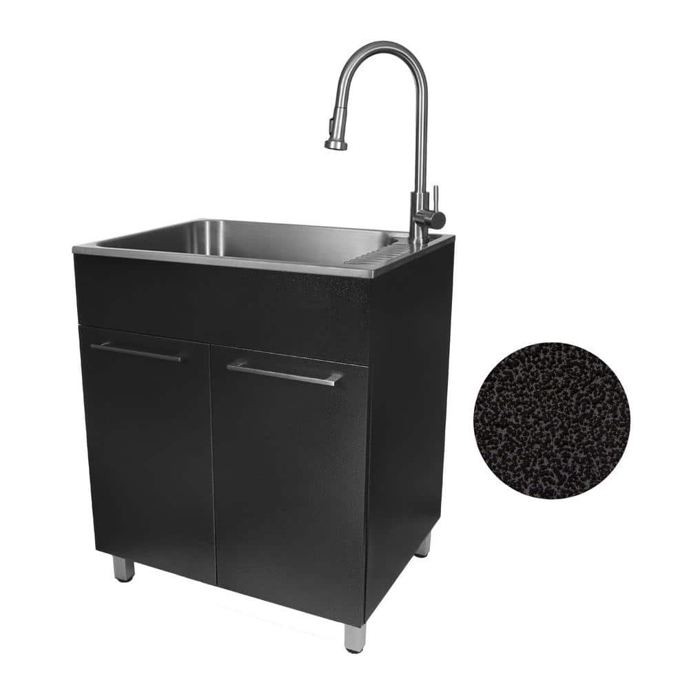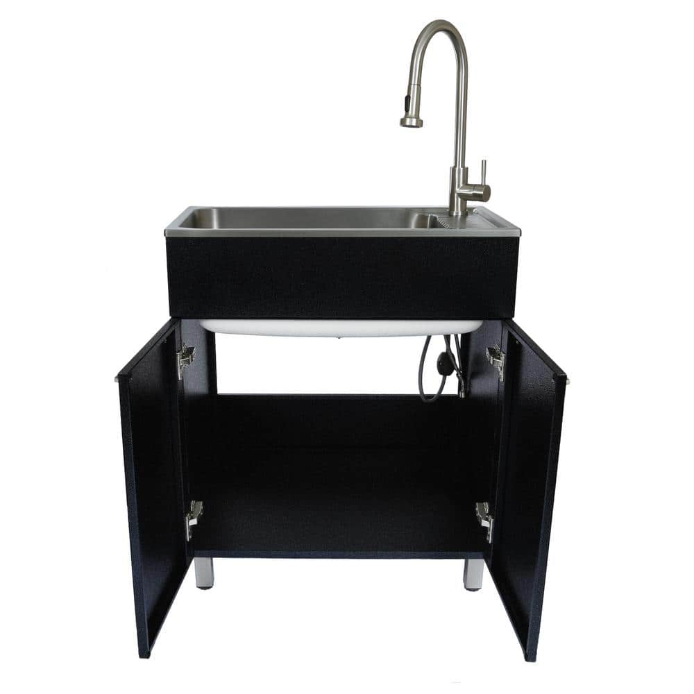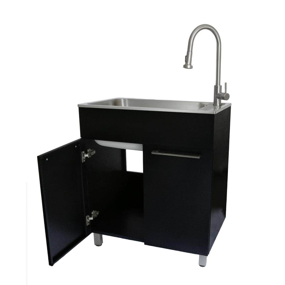 Glacier Bay 28 in. W x 10 in. D x 22 in. L Freestanding Stainless Steel Laundry Sink with Faucet and Double Door Cabinet in Black