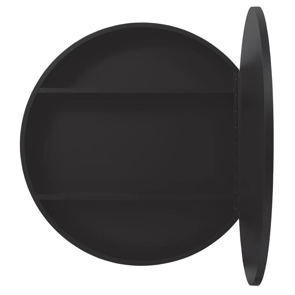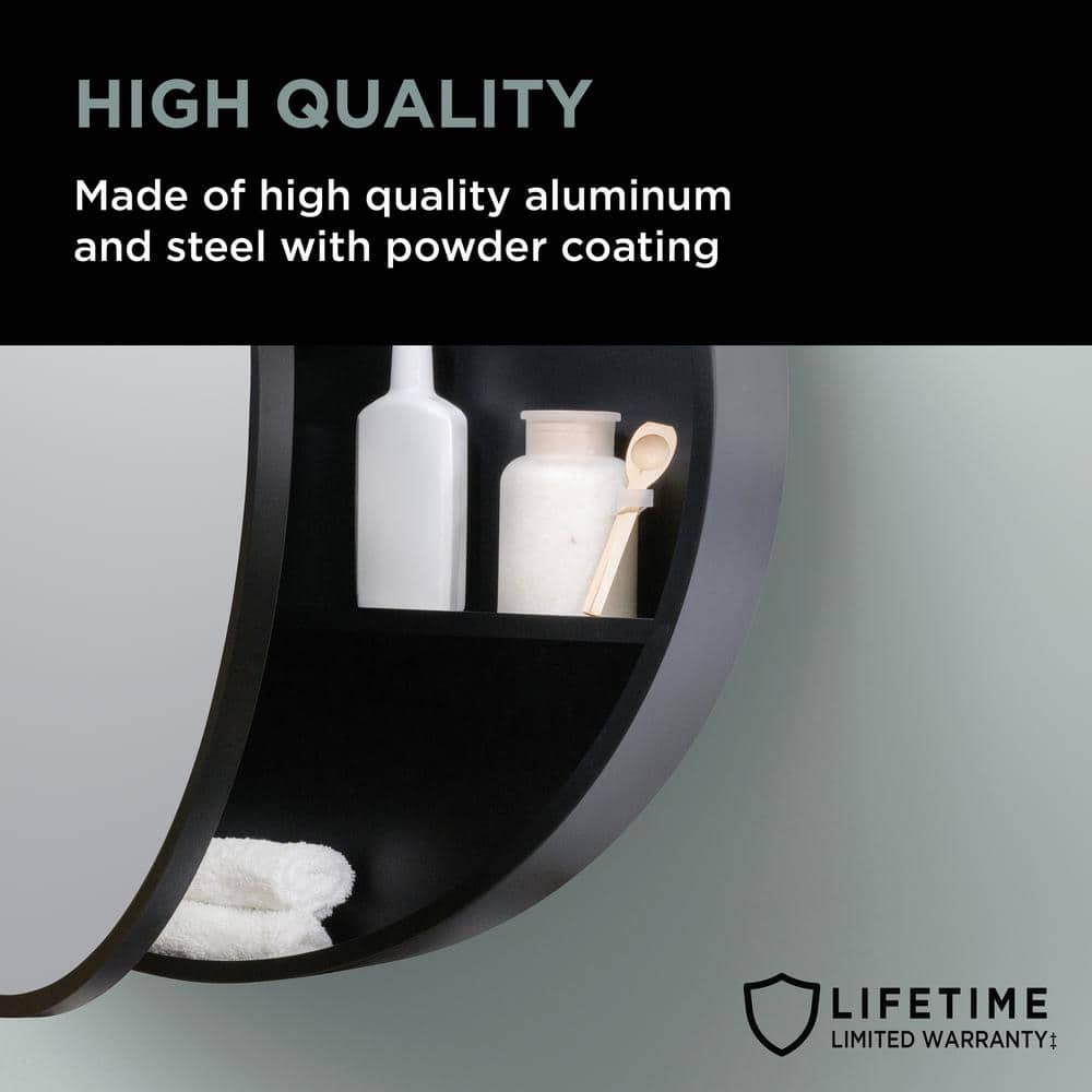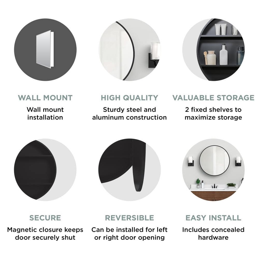 Refresh your bathroom with the Glacier Bay Round Matte Black Medicine Cabinet. This stylish mirror cabinet features a durable steel body and an elegant, minimalistic aluminum frame. Ideal for modern spaces, it offers dual swing doors with 2 fixed shelves for ample storage.
