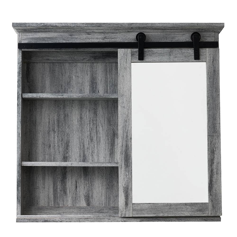 Elevate your bathroom storage with the Glacier Bay Washed Gray Medicine Cabinet. This barn door style cabinet boasts a sleek wood casing and functional mirror, offering adjustable shelving to accommodate your needs. Ideal for those seeking both style and practicality in their bathroom setup.