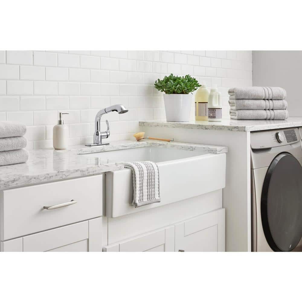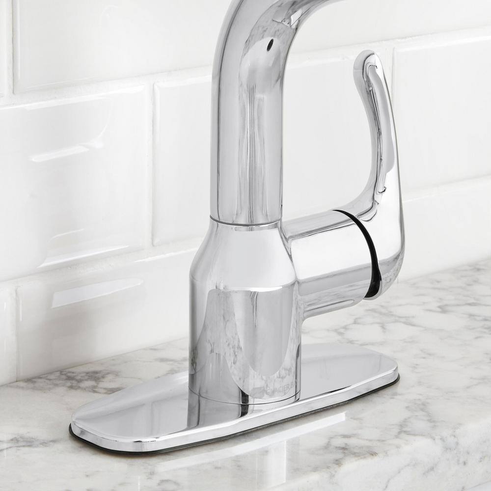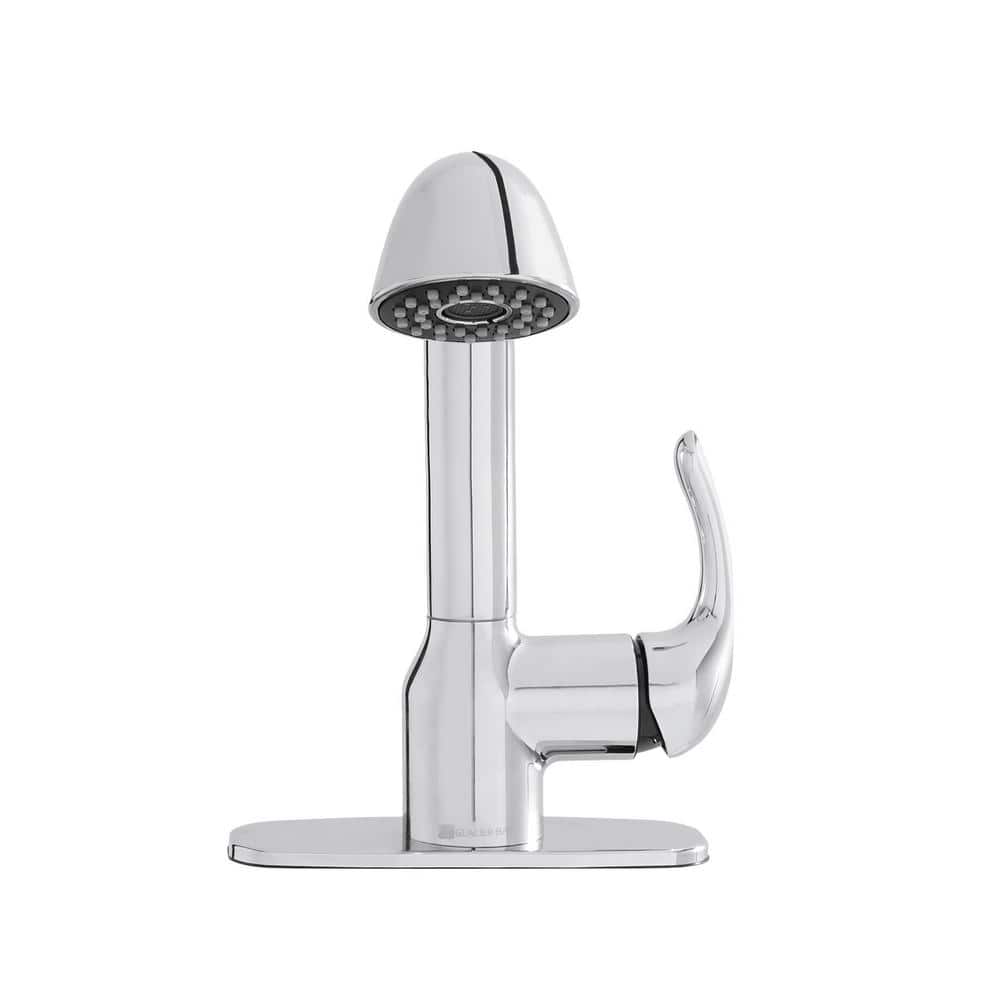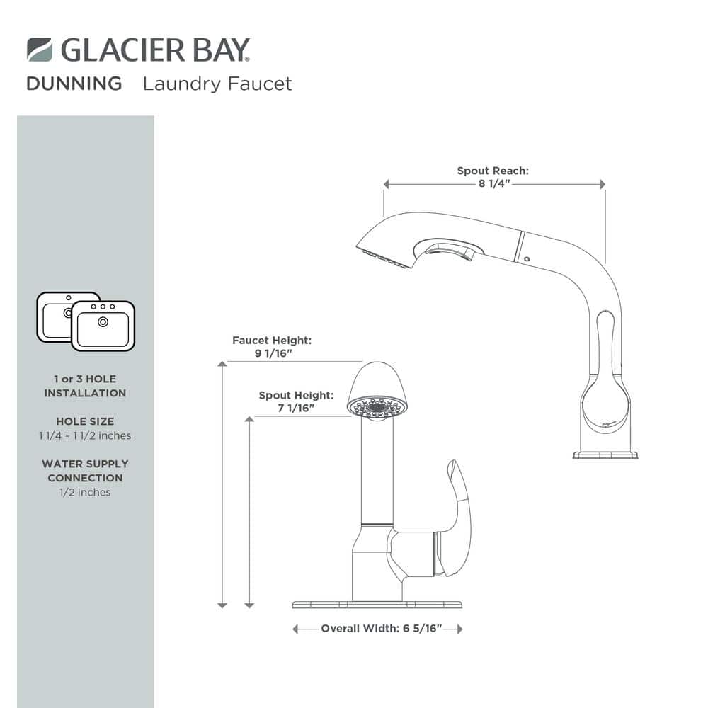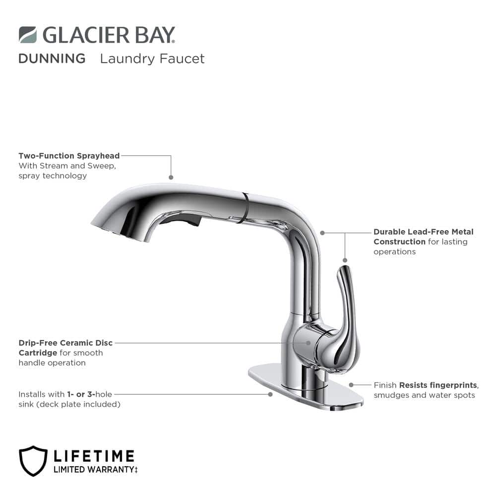 The Glacier Bay Dunning Single-Handle Pull-Out Laundry Utility Faucet in Chrome blends style with functionality, perfect for any utility or laundry room. With a durable pull-out spray head offering dual functionality, and a user-friendly single-handle design, managing water flow and temperature becomes effortless. Ideal for maintaining a contemporary yet practical space.