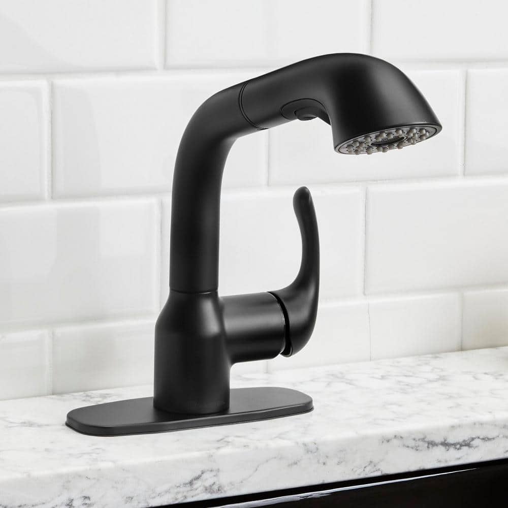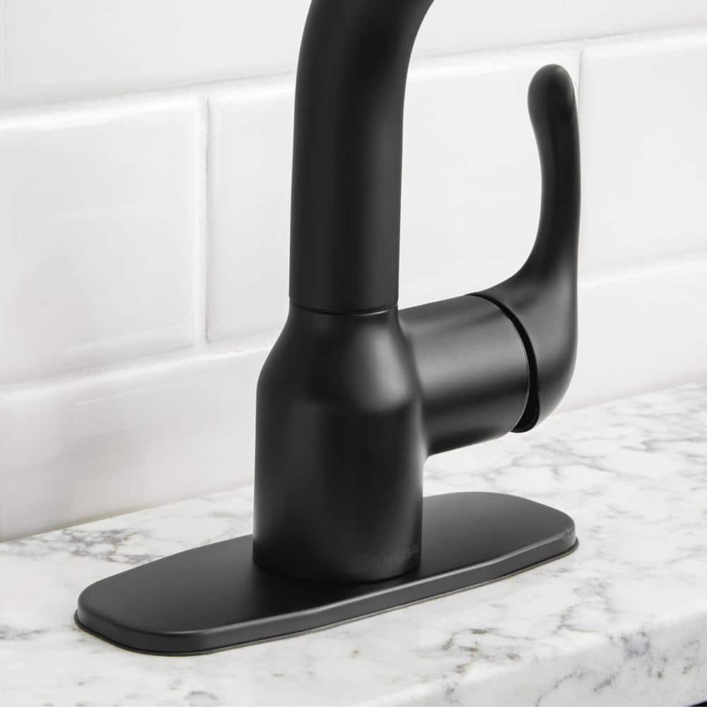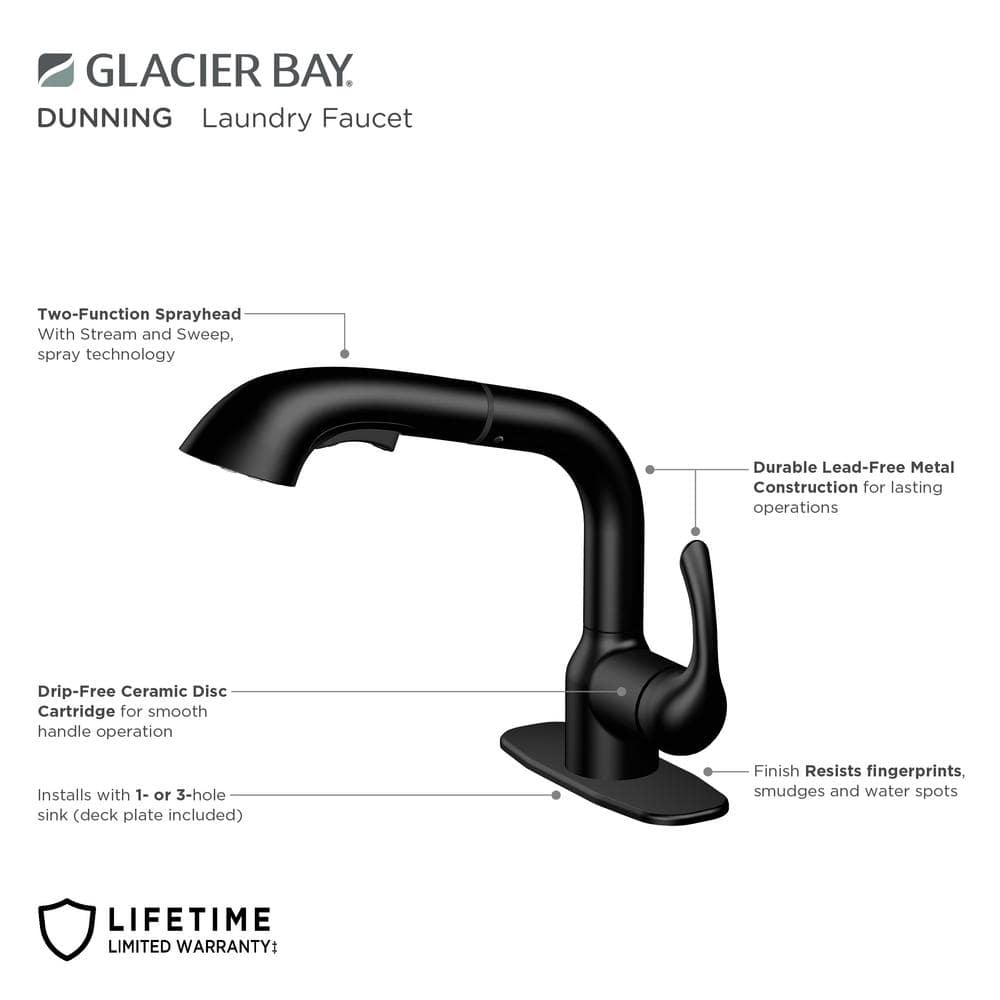 Elevate your laundry room with the Glacier Bay Dunning Matte Black Pull-Out Laundry Faucet. Featuring a two-function spray head and durable ceramic disc valves, this stylish faucet ensures easy operation and long-lasting performance.