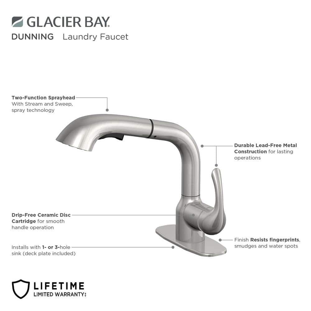 Upgrade your laundry room with the Glacier Bay Dunning Single-Handle Pull-Out Laundry Utility Faucet. Designed with a robust dual-spray function and a spot-resistant stainless finish, this faucet is both stylish and efficient, making it perfect for any laundry task.