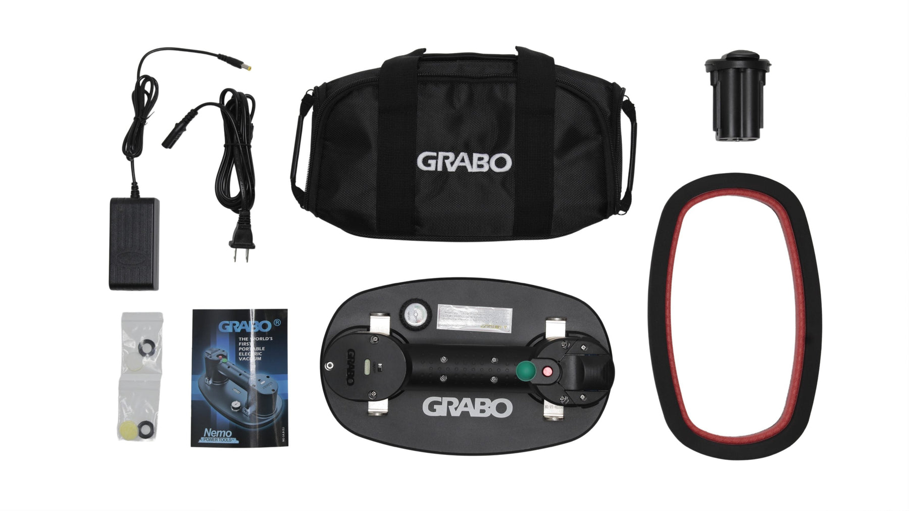 A: The GRABO kit includes the vacuum lifter tool, a 14.8 volt 2.6 Ah Li-ion battery, a wall charger, a canvas bag, and an instruction manual.