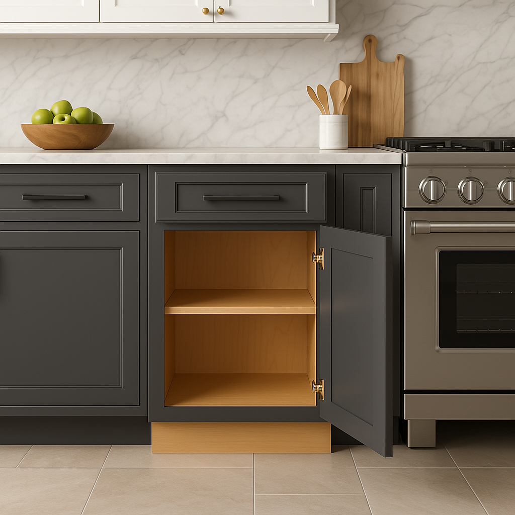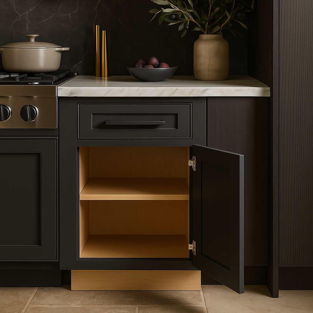 The Grayson Deep Onyx Kitchen Cabinet combines modern elegance with practical functionality. Featuring durable plywood construction, soft-close mechanisms, and a sophisticated dark gray finish, this cabinet is perfect for enhancing any kitchen space.