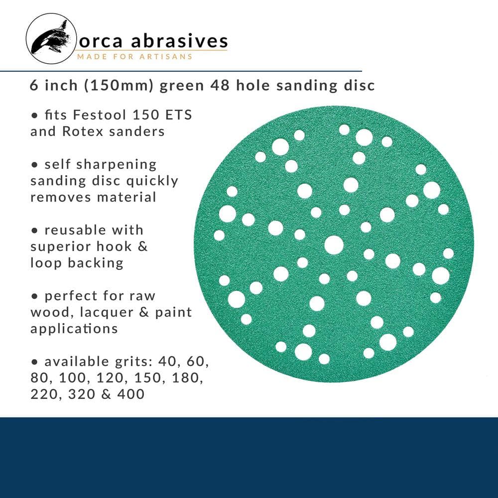 Streamline your sanding projects with Orca Green's 6-inch Sanding Discs, designed for efficiency and longevity. Crafted with hardened Aluminum Oxide and synthetic resin, these discs self-sharpen to reduce sanding time on wood, paint, plastic, and metal surfaces, offering unparalleled durability and performance.