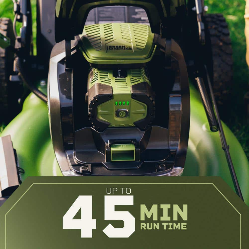 A: The 62V 4.0 Ah battery powers the mower for up to 45 minutes on a full charge, which is typically sufficient for mowing up to 1/2 acre.