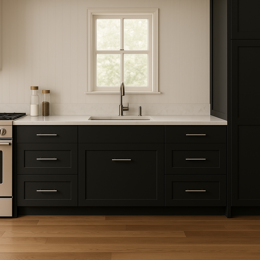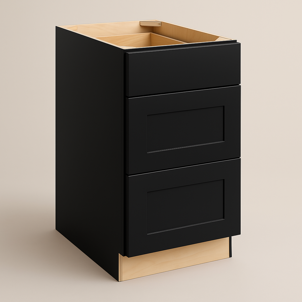 The Hampton Bay Avondale Shaker Drawer Base Cabinet combines premium plywood construction with a sleek black painted finish, offering durability and style. Featuring soft-close drawers and quick assembly technology, this cabinet is perfect for modern kitchens.