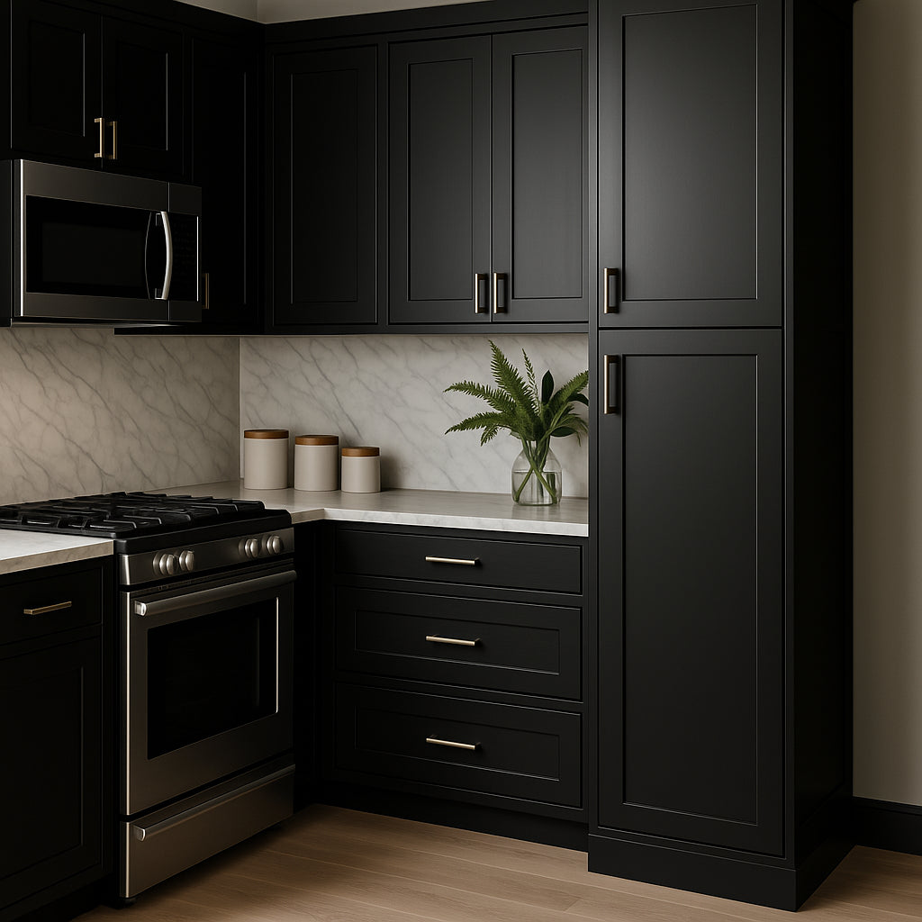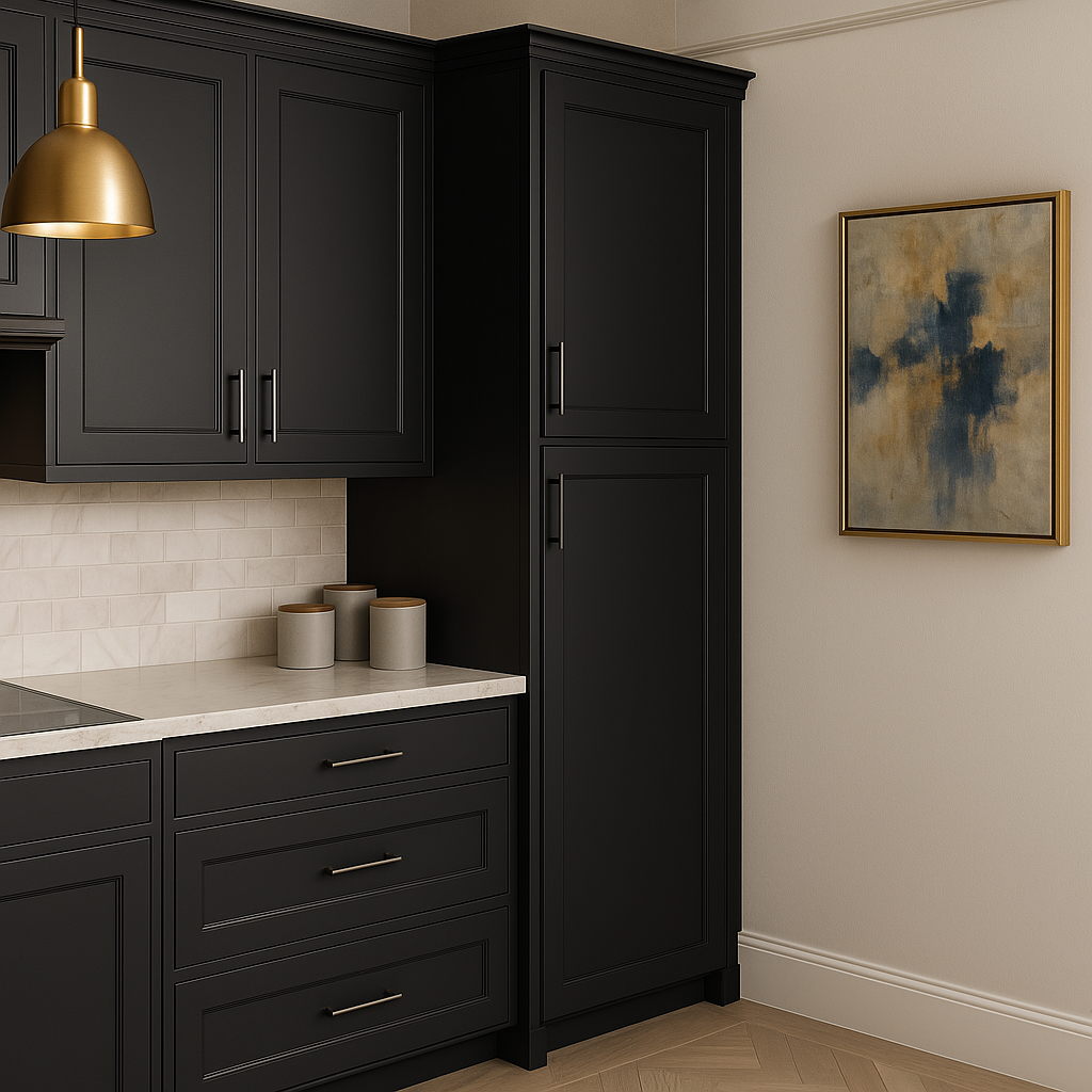 The Hampton Bay Avondale Shaker Pantry Cabinet in Raven Black combines style and functionality with its durable plywood construction and sleek painted finish. Featuring soft-close doors and adjustable shelves, this cabinet is perfect for organizing your kitchen essentials.