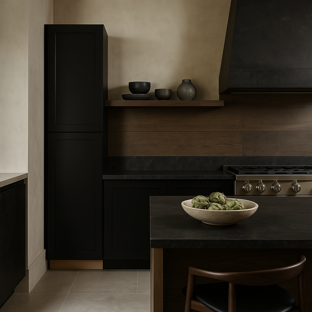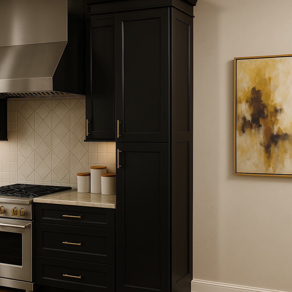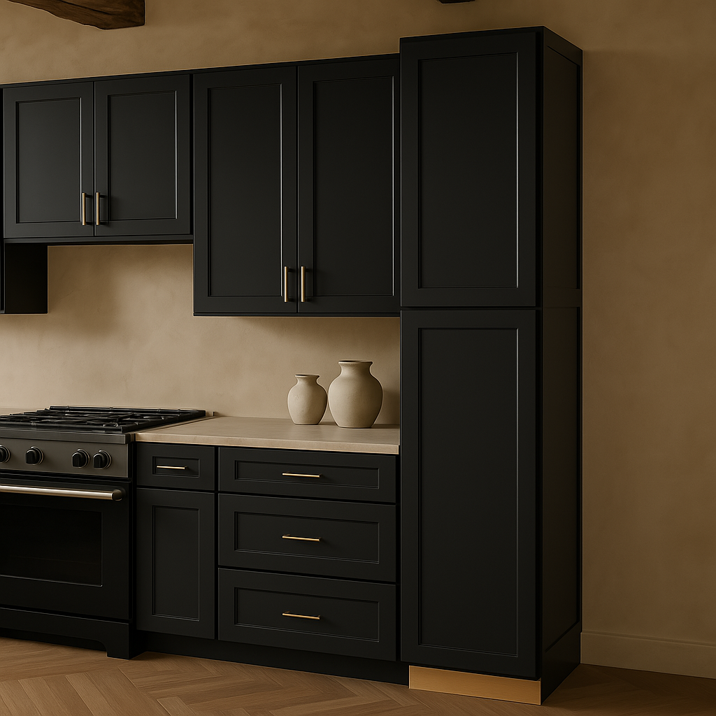 The Hampton Bay Avondale Shaker Pantry Cabinet in Raven Black combines style and functionality with its durable plywood construction and sleek shaker design. Featuring soft-close doors and adjustable shelves, this cabinet is perfect for organizing kitchen essentials.