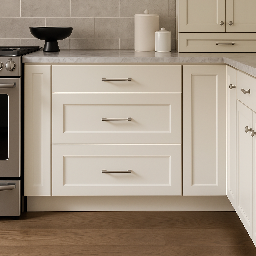 The Hampton Bay Avondale Shaker Drawer Base Cabinet combines traditional shaker styling with a creamy antique white finish, offering a durable plywood construction and soft-close drawers for smooth operation. Its quick-assemble technology ensures easy installation in less than 20 minutes.