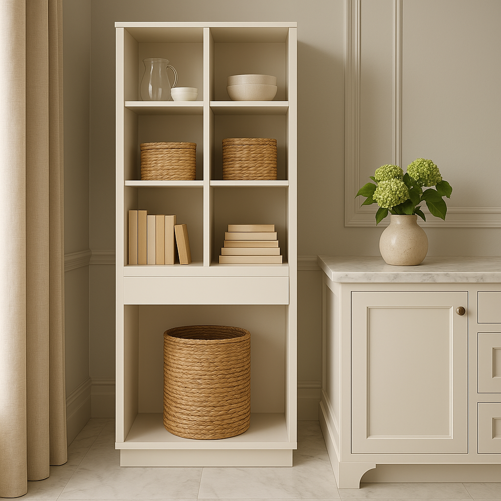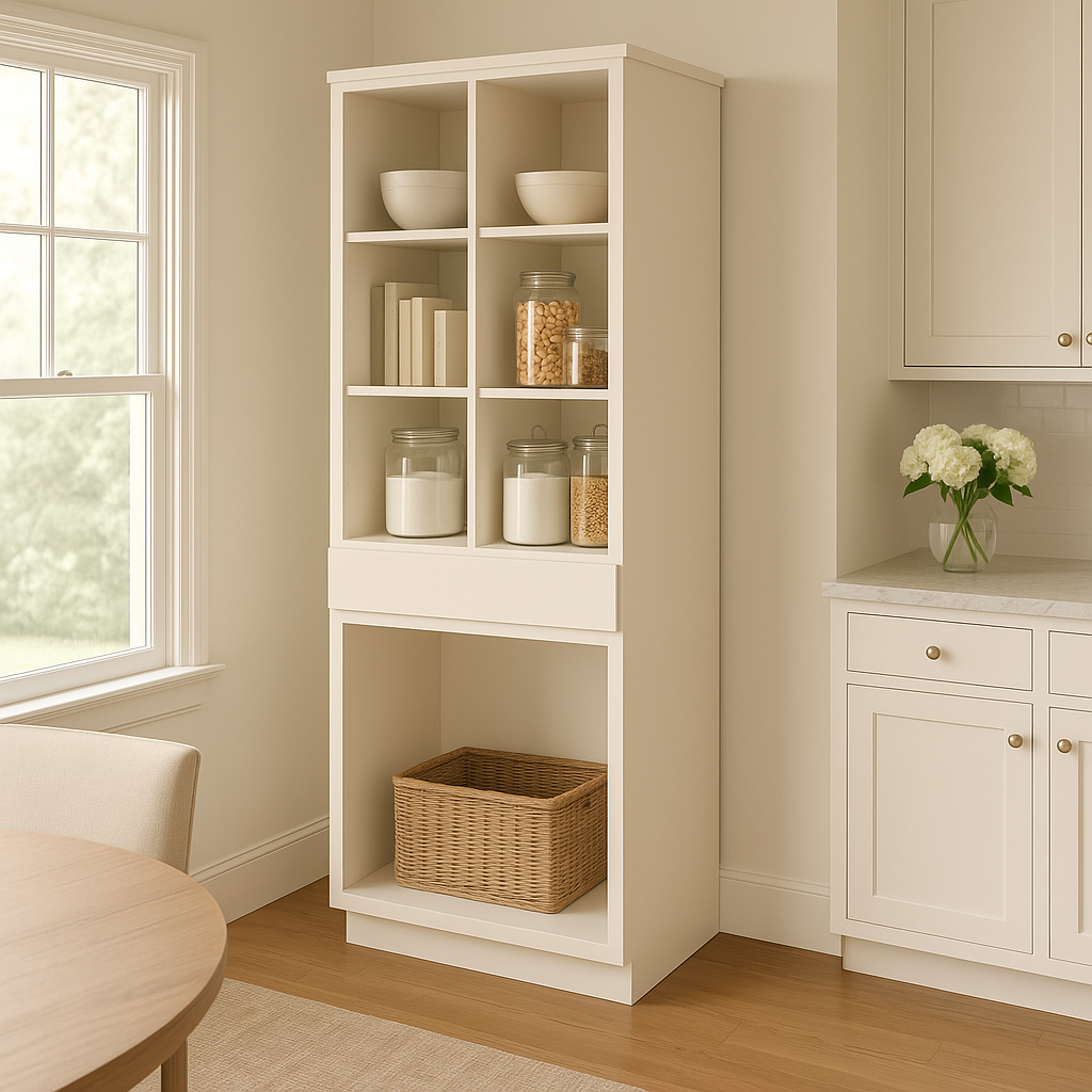 The Hampton Bay Avondale Shaker Open Pantry Kitchen Cabinet combines durable plywood construction with a premium painted finish for timeless beauty. Featuring adjustable shelves and soft-close doors, this cabinet is designed for easy assembly and seamless integration into your kitchen.