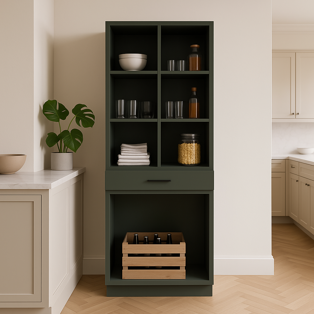 The Hampton Bay Avondale Pantry Cabinet is a masterpiece of modern design, blending shaker-style sophistication with a rich fern green finish. Its adjustable shelves and soft-close doors offer both functionality and luxury, making it a perfect addition to any kitchen. Pair it with natural wood accents and sleek appliances to create a harmonious and inviting space. This cabinet is not just storage—it's a statement of refined taste and enduring quality.