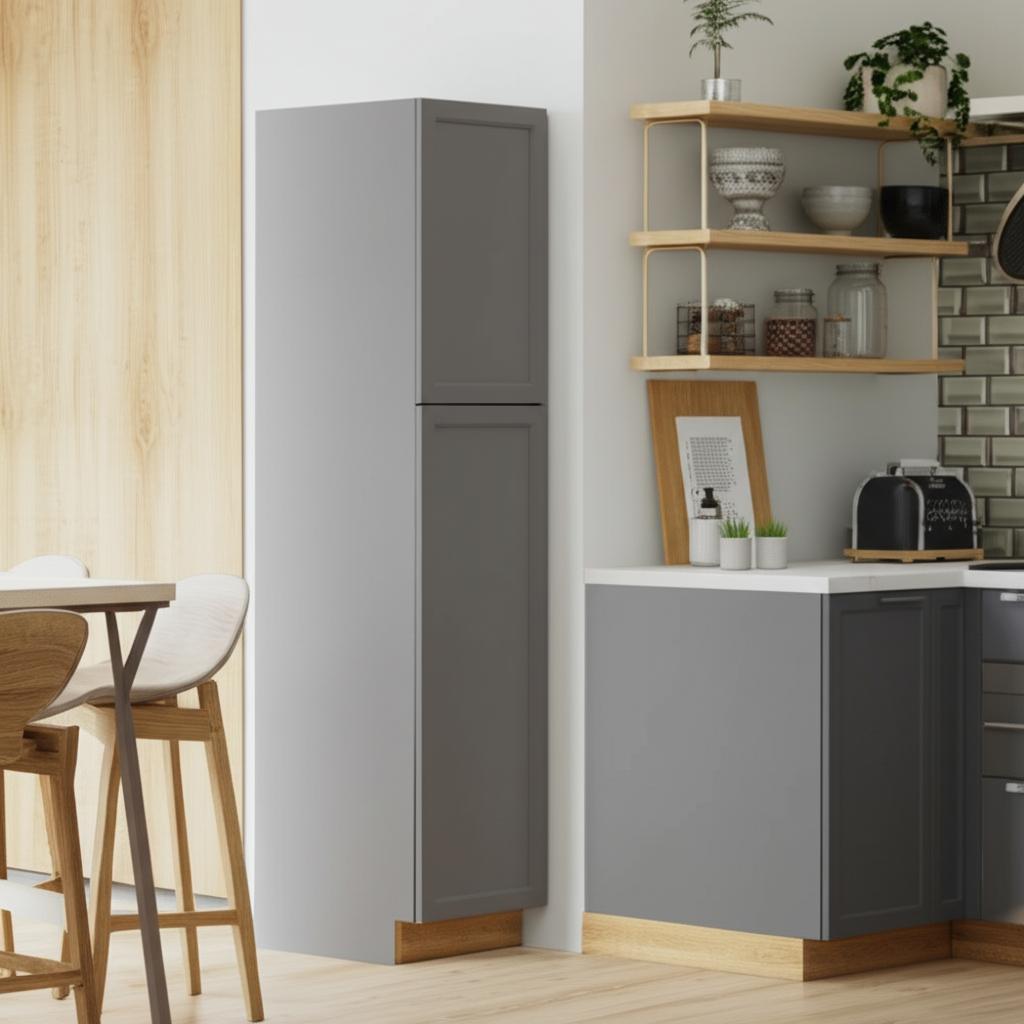 Elevate your kitchen's aesthetic with the Storm Gray Shaker Pantry Cabinet, a masterpiece of modern design. Its sleek shaker doors and rich gray finish create a sophisticated ambiance, seamlessly blending with various color palettes. Style it with under-cabinet lighting to accentuate its architectural beauty, or pair it with bold countertops for a striking contrast. This cabinet is not just a storage solution but a statement piece that embodies refined living.