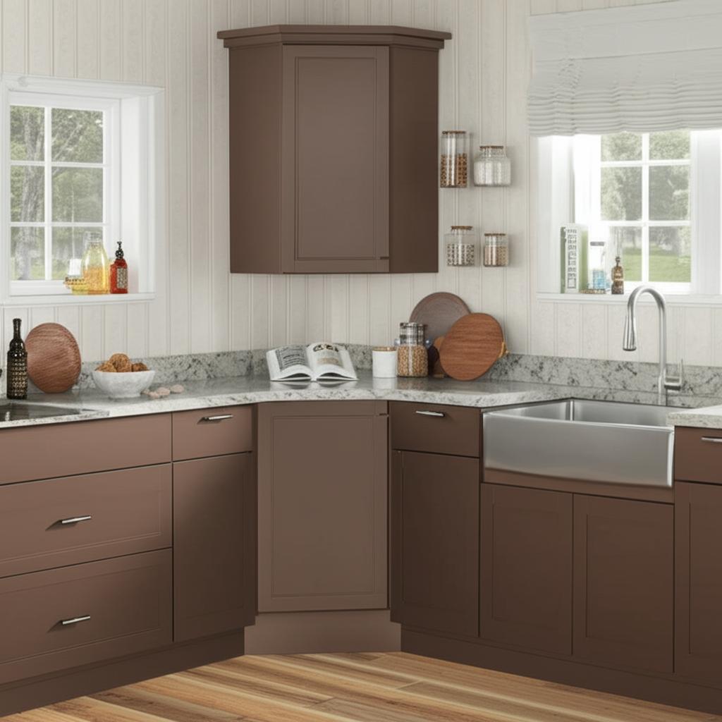 This corner cabinet is a masterpiece of modern elegance, with its rich brindle finish and shaker design that seamlessly blends simplicity with sophistication. It transforms a kitchen corner into a functional yet stylish focal point, complementing natural stone countertops and metallic hardware for a chic aesthetic. Perfect for creating a luxurious culinary space, this cabinet is both practical and visually stunning.