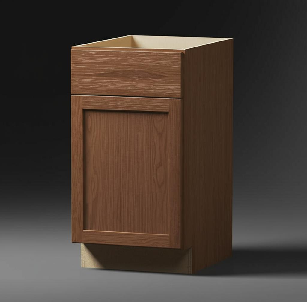 Imagine a kitchen graced by the understated elegance of the Sinclair Shaker Saddle Oak Base Cabinet. Its exquisite shaker design, reminiscent of classic sophistication, subtly transforms the space with a blend of modern utility and traditional charm. Style it alongside white quartz countertops and copper accents for a captivating contrast that enchants the eye. With its balance of form and function, this cabinet is not just furniture—it's an essential element of luxurious living.