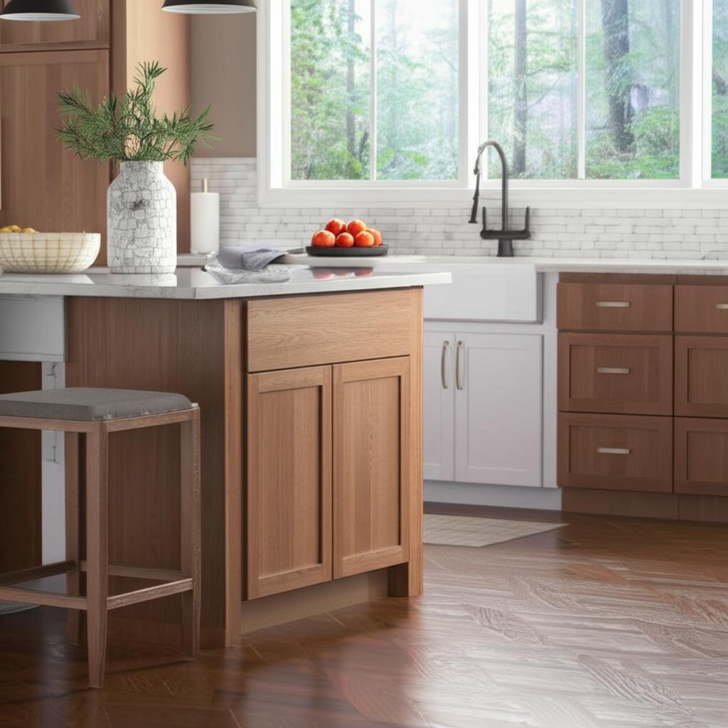 The Hampton Bay Sinclair Base Cabinet combines classic shaker styling with a rich Saddle Oak finish, offering a premium look for your kitchen. Its durable construction, adjustable shelving, and smooth ball-bearing drawer glides provide versatile storage and effortless operation.