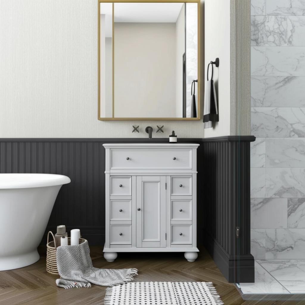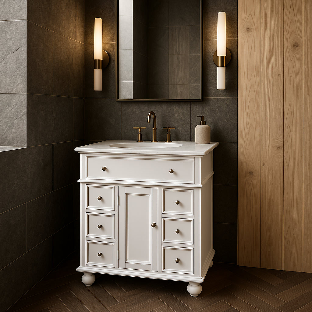 • Elegant Marble Top: Features a white natural marble top with pre-attached porcelain sink.