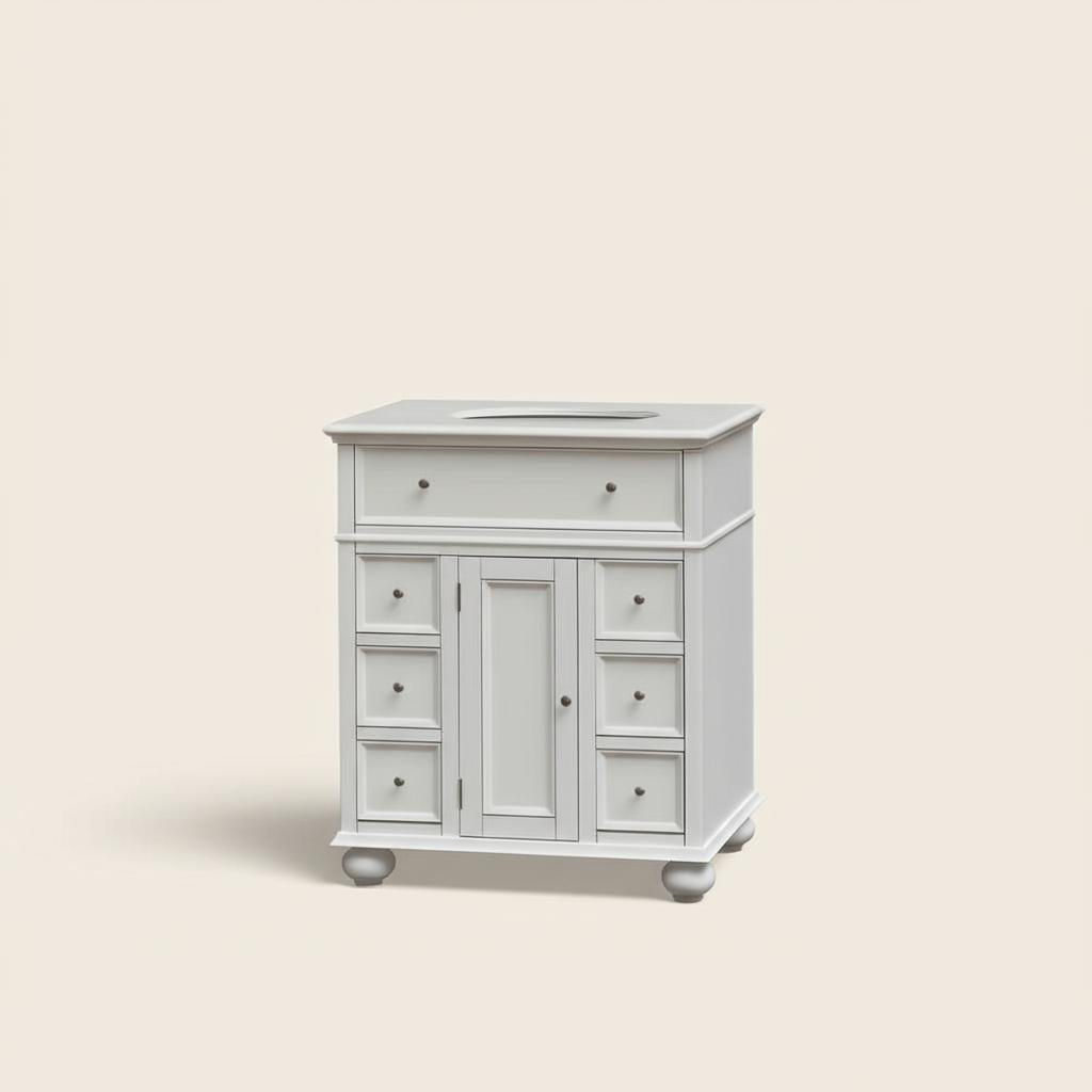 Transform your bathroom into a serene retreat with the Hampton Harbor Vanity. Its white marble top and porcelain sink exude timeless elegance, while the chrome hardware adds a modern touch. Pair it with soft pastel walls and a vintage mirror for a charming aesthetic. This vanity is not just a fixture; it's a statement of refined taste and luxurious living.