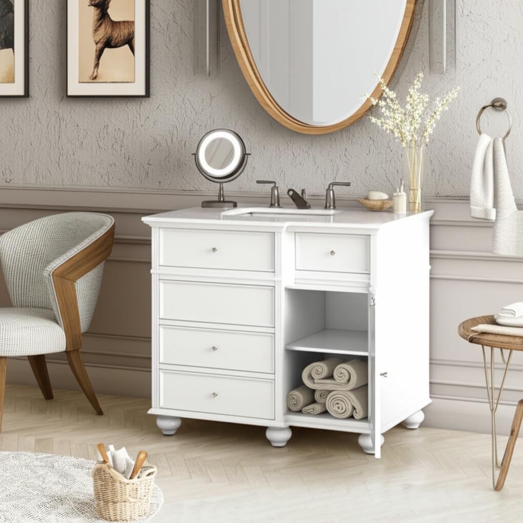 The Hampton Harbor Bath Vanity is a masterpiece of design and functionality, bringing a touch of timeless elegance to your bathroom. Its white marble top and tapered ball feet exude sophistication, while the ample storage space ensures practicality. Pair it with chrome fixtures and soft lighting to create a serene and luxurious retreat. This vanity is not just a piece of furniture; it's a statement of refined taste.