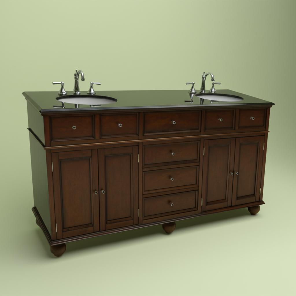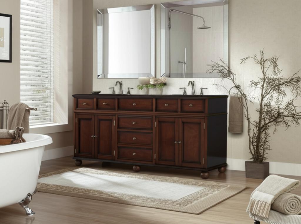 Elevate your bathroom's aesthetic with this exquisite double sink vanity. The rich Sequoia finish and black granite top create a striking contrast, while the recessed paneling and bun feet add a touch of traditional charm. Style it with elegant mirrors and soft lighting to create a serene and luxurious retreat. This vanity is not just a piece of furniture; it's a statement of refined taste.