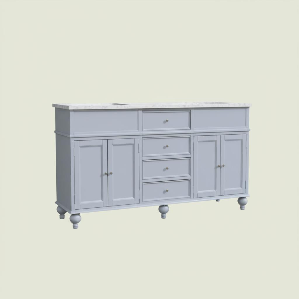 Elevate your bathroom's aesthetic with the Hampton Harbor Double Sink Vanity. Its exquisite marble top and elegant recessed paneling create a timeless appeal, while the bun feet and crown molding add a touch of sophistication. Pair it with matching mirrors and chrome fixtures to complete the look. This vanity is not just a piece of furniture; it's a statement of refined taste and luxurious living.