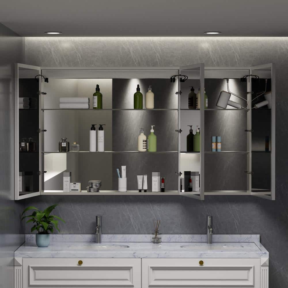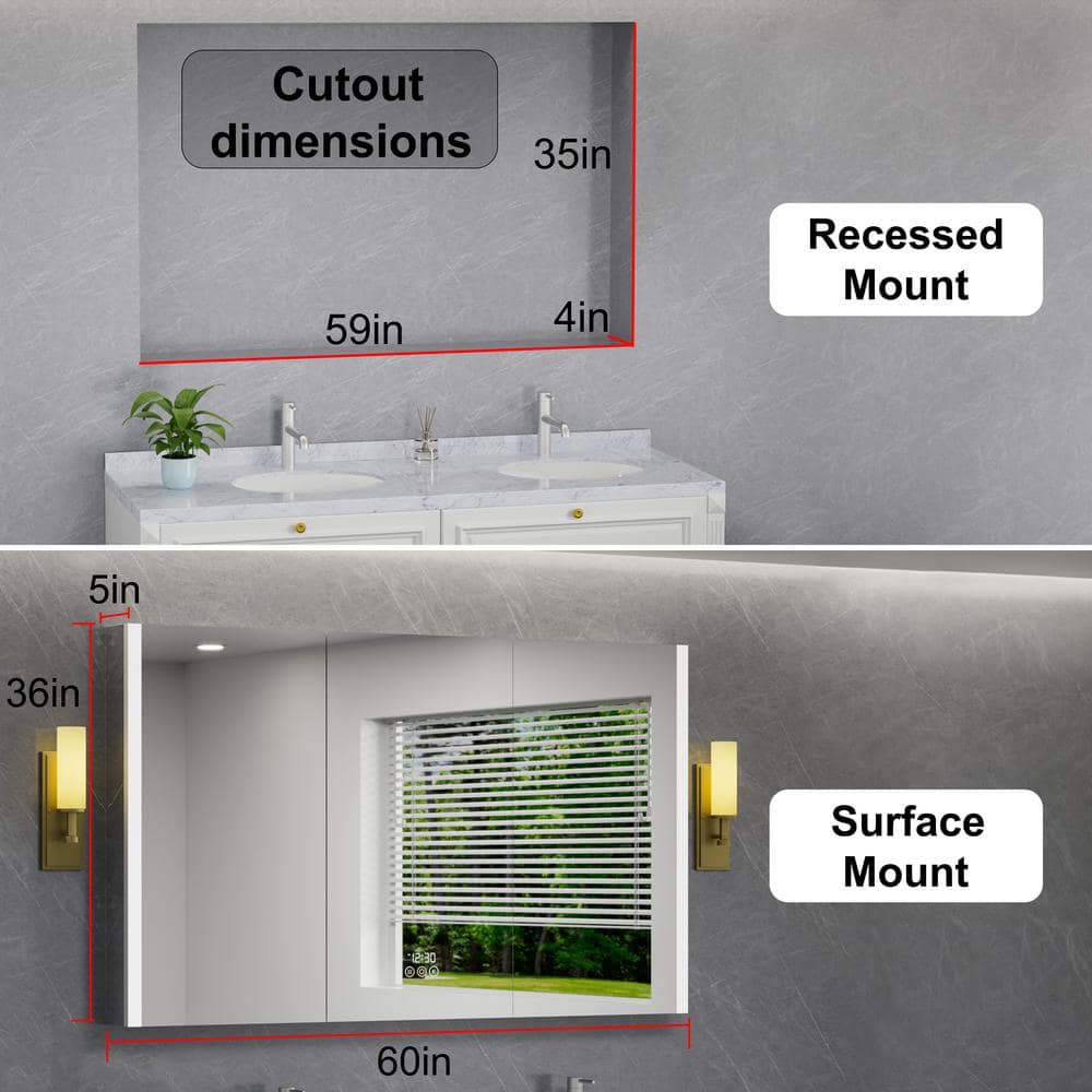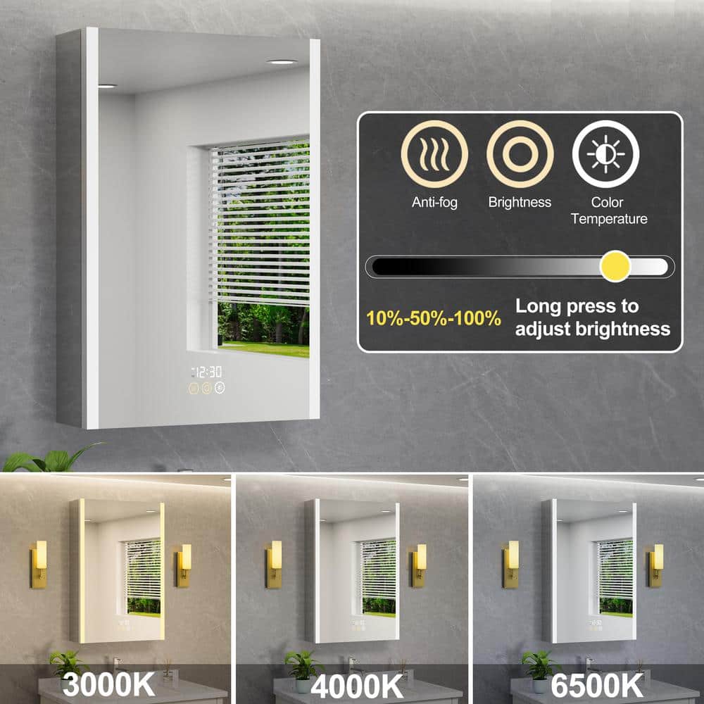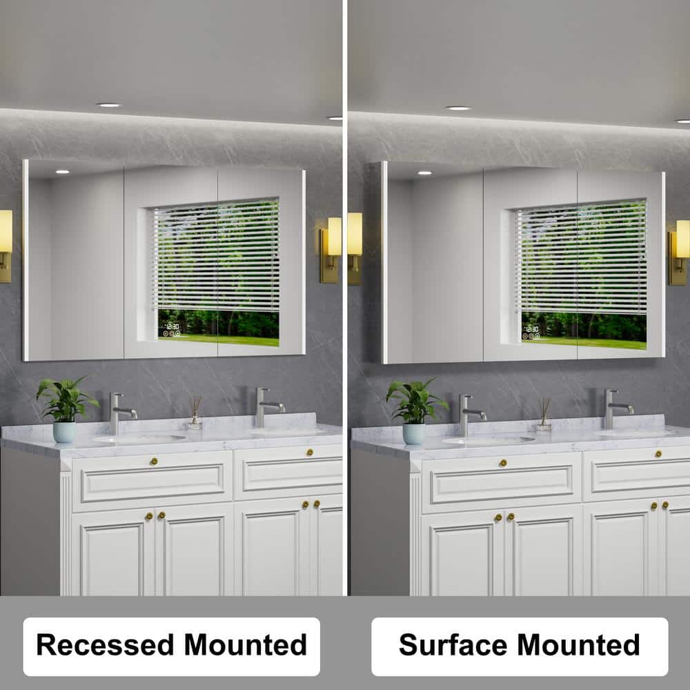 The HBEZON Eos Medicine Cabinet revolutionizes bathroom storage with modern conveniences like tri-color LED lighting and a fog-free mirror. Designed for both recessed and surface mount installations, it features an integrated digital display and outlets for ultimate functionality and style.