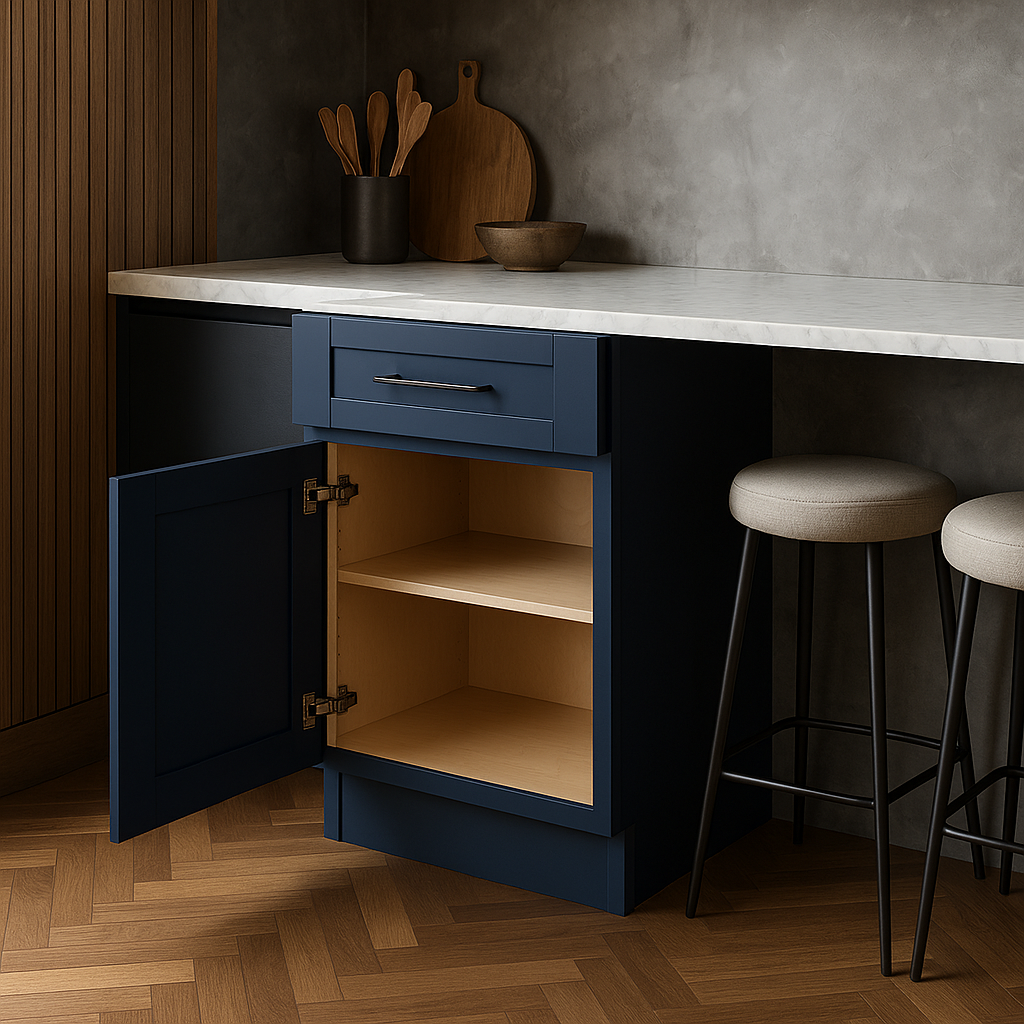 The Washington Vessel Blue Shaker Base Cabinet combines modern design with durable construction. Featuring a deep blue vinyl finish, soft-close technology, and CARB II compliant plywood, this cabinet offers both style and functionality for your kitchen.