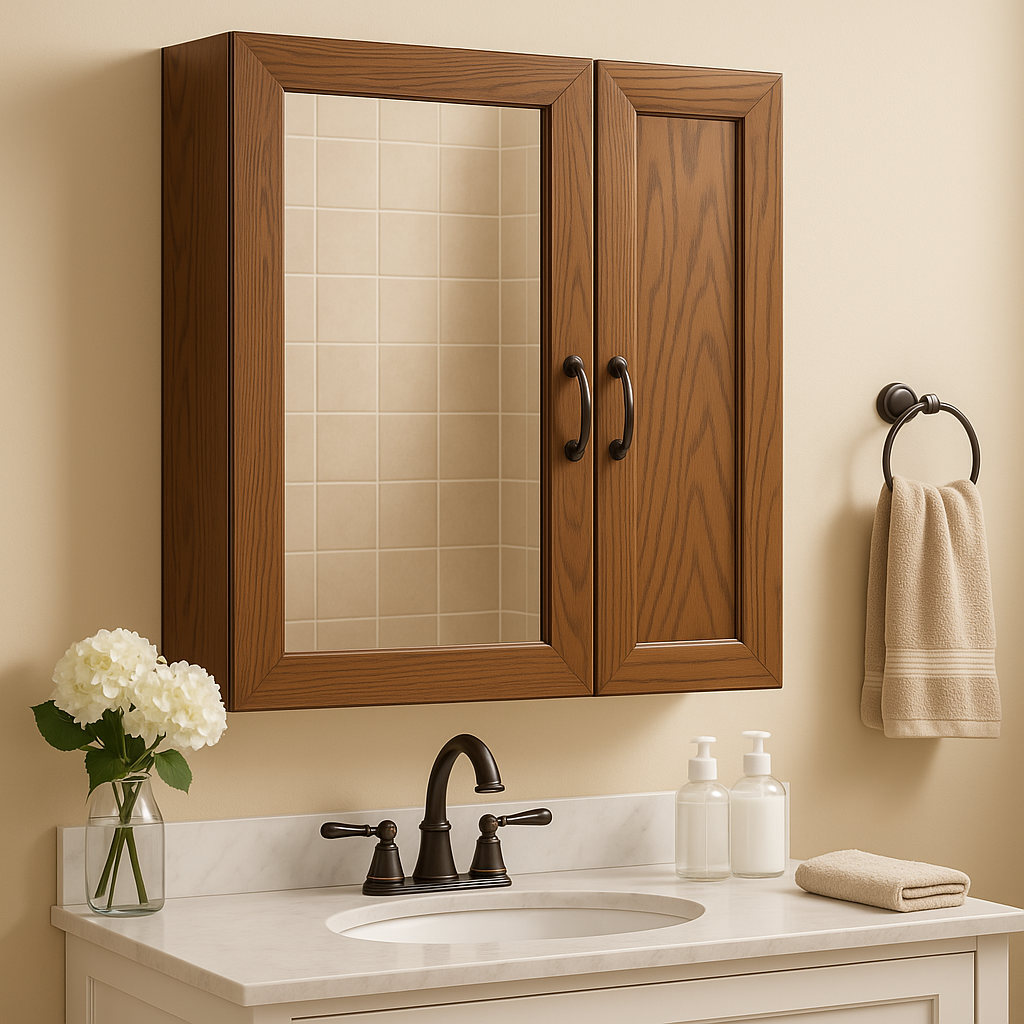 The Alster Medicine Cabinet combines elegance and practicality with its natural wood grain design and beveled mirror. Featuring adjustable shelves and soft-close doors, it offers a stylish and functional storage solution for any bathroom.