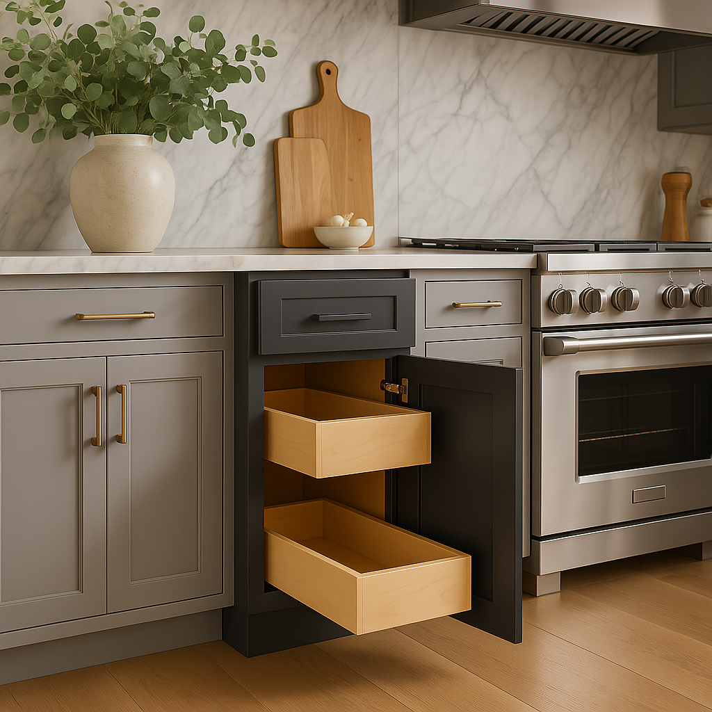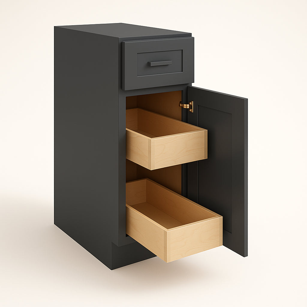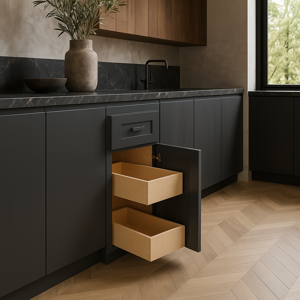 The Grayson Deep Onyx cabinet transforms any kitchen into a haven of sophistication. Its sleek, dark finish complements both modern and traditional spaces, while the soft-close doors and drawers add a touch of luxury. Pair it with marble countertops and brass fixtures for a stunning contrast that exudes elegance. This cabinet is not just a storage solution but a statement piece that elevates your culinary space.