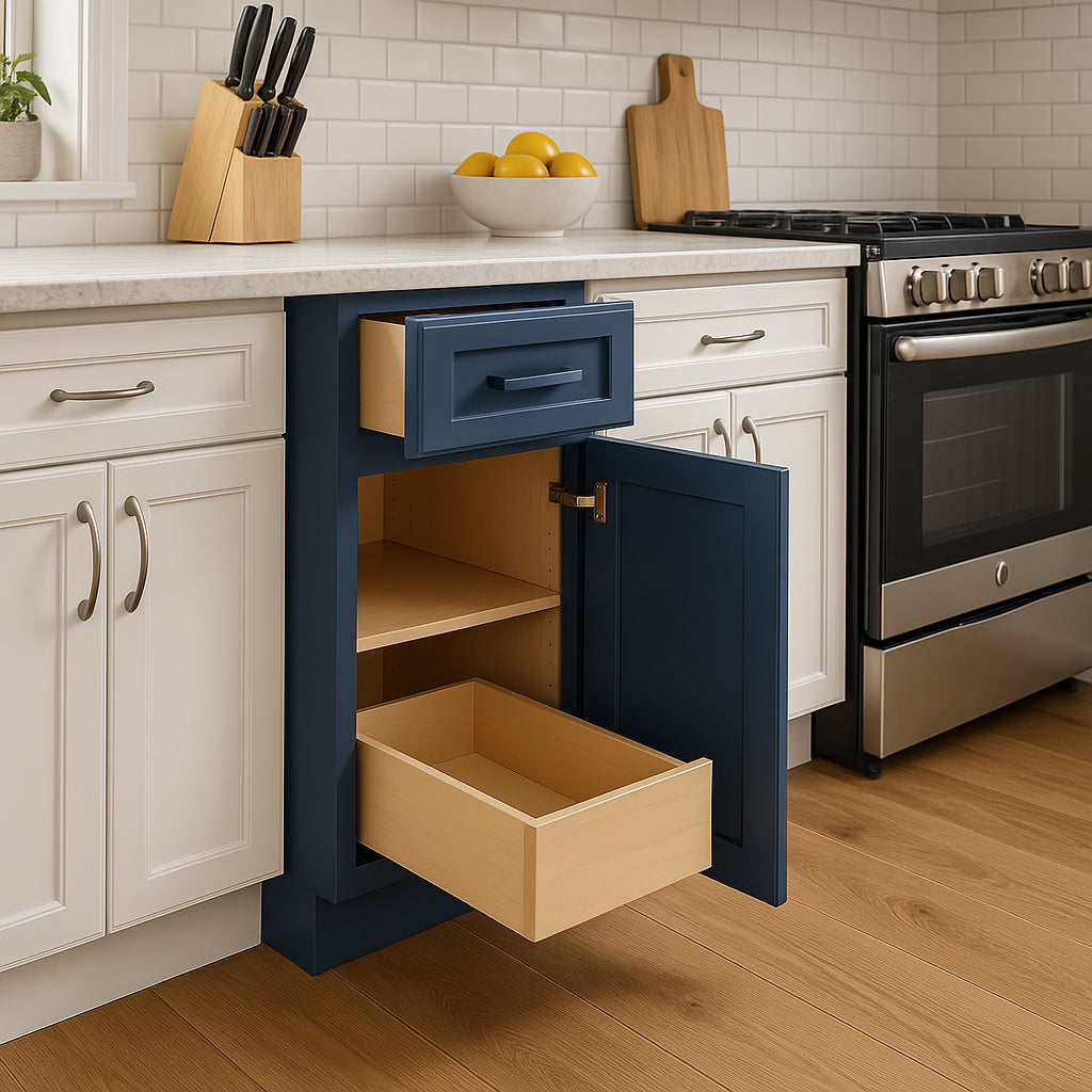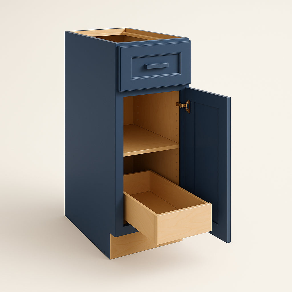 The Grayson Mythic Blue kitchen cabinet combines durable plywood construction with a striking painted finish, offering both elegance and functionality. Featuring soft close mechanisms and a transitional Shaker design, this cabinet is perfect for modern kitchens.