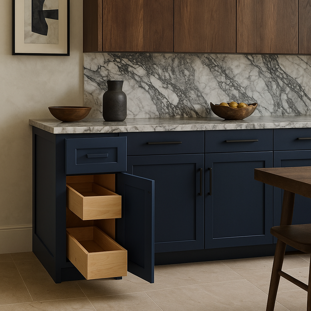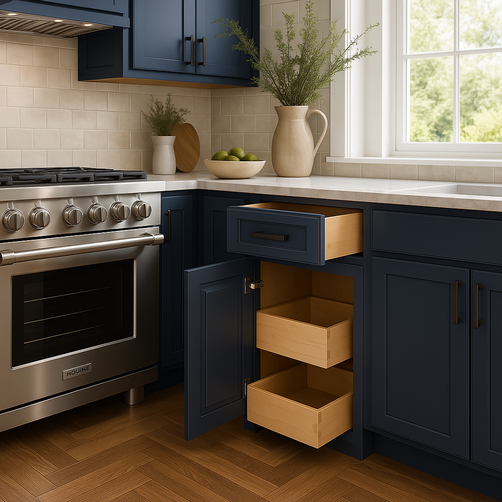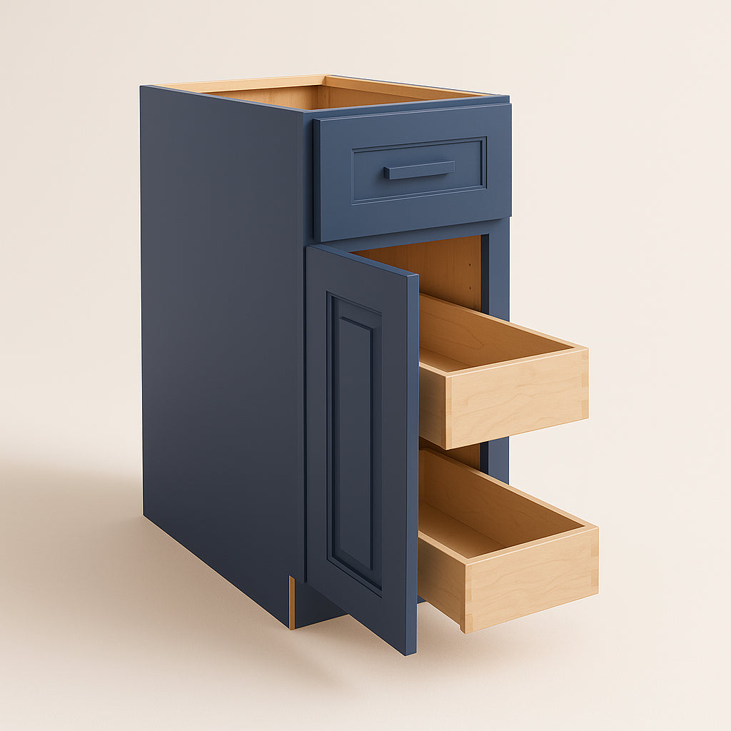 The Grayson Mythic Blue Base Kitchen Cabinet combines durable all-plywood construction with a stylish dark blue finish. Featuring soft-close doors and drawers, it offers both functionality and elegance for modern kitchens.
