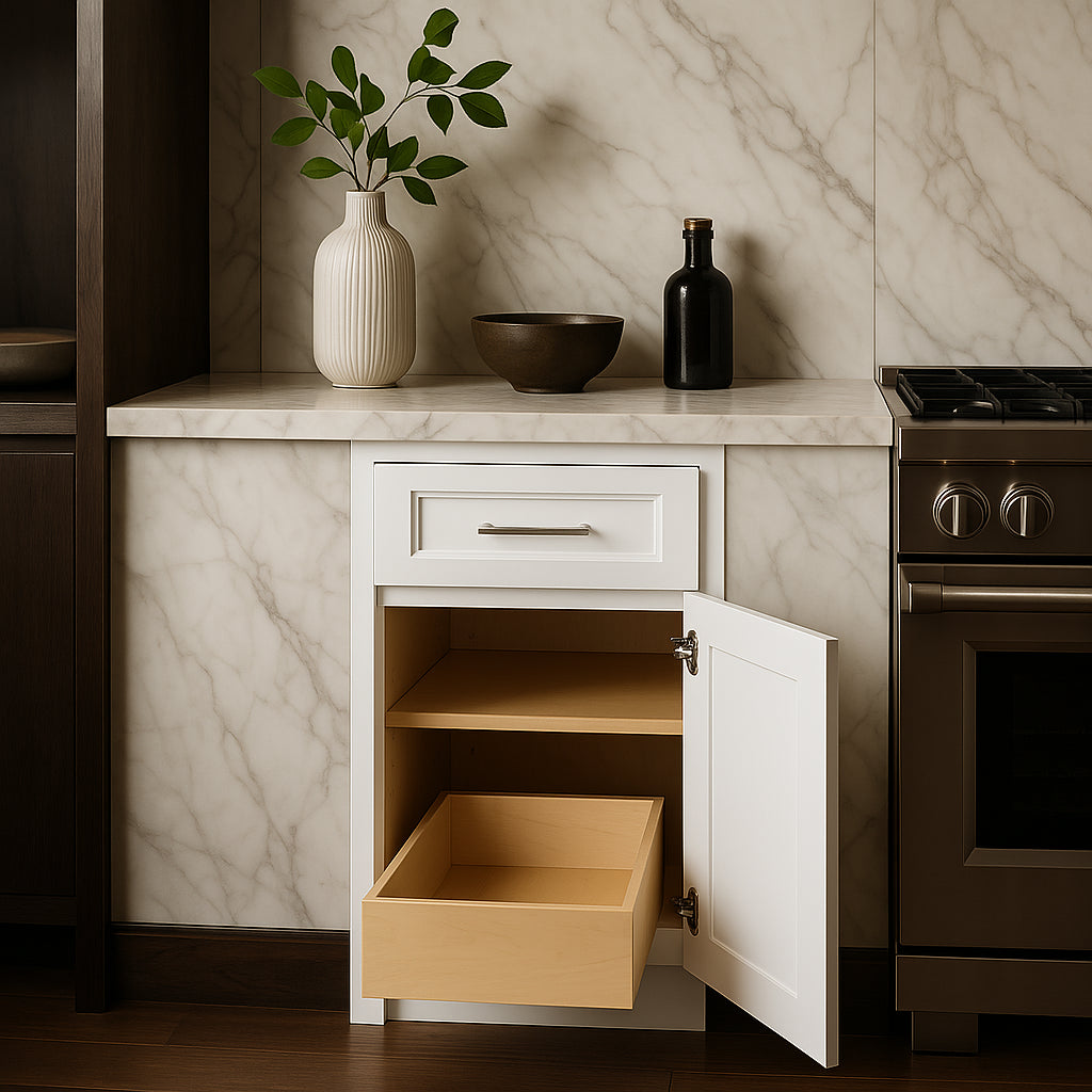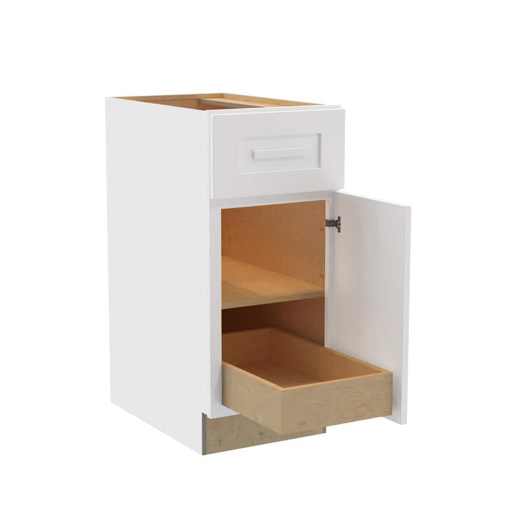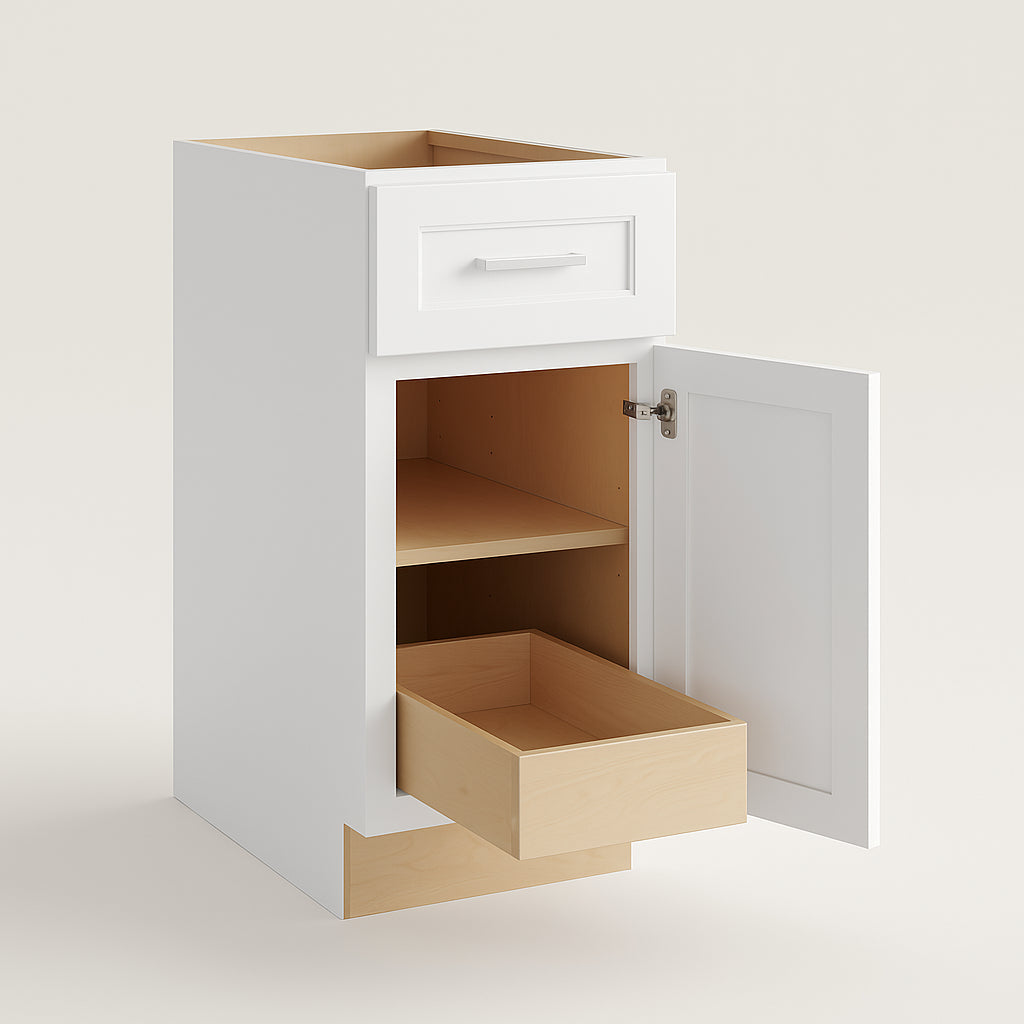 The Grayson Base Kitchen Cabinet in Pacific White combines elegant design with practical functionality. Featuring CARB-compliant plywood construction and soft-close doors, it offers durability and a serene aesthetic for modern kitchens.