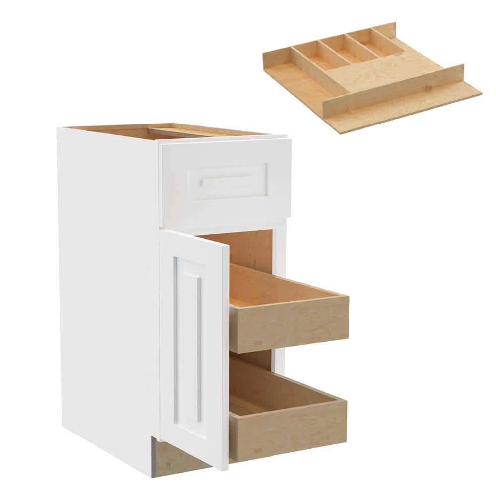 The Grayson Base Kitchen Cabinet by Home Decorators Collection combines timeless design with superior craftsmanship. Featuring a Pacific White finish, it offers soft-close doors and drawers, adjustable shelves, and roll-out trays for organized storage.