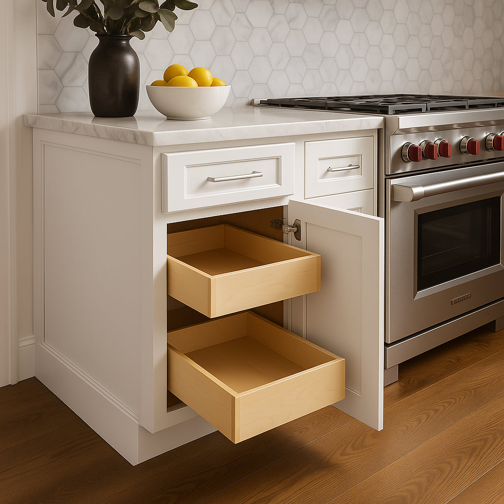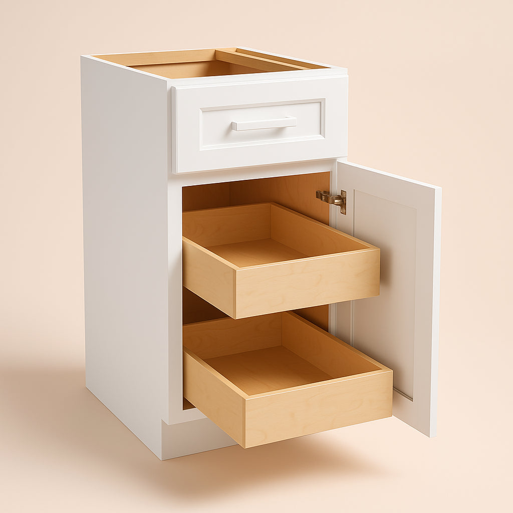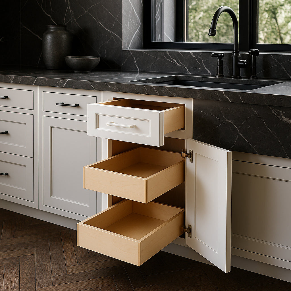 The Grayson Base Kitchen Cabinet is a masterpiece of design and functionality, seamlessly blending into any kitchen aesthetic. Its Pacific White finish radiates a timeless elegance, while the soft-close technology and dovetail joints elevate its luxurious appeal. Pair it with stainless steel appliances for a modern look or vintage hardware for a classic charm. This cabinet is not just storage; it's a statement of refined taste and practical sophistication.