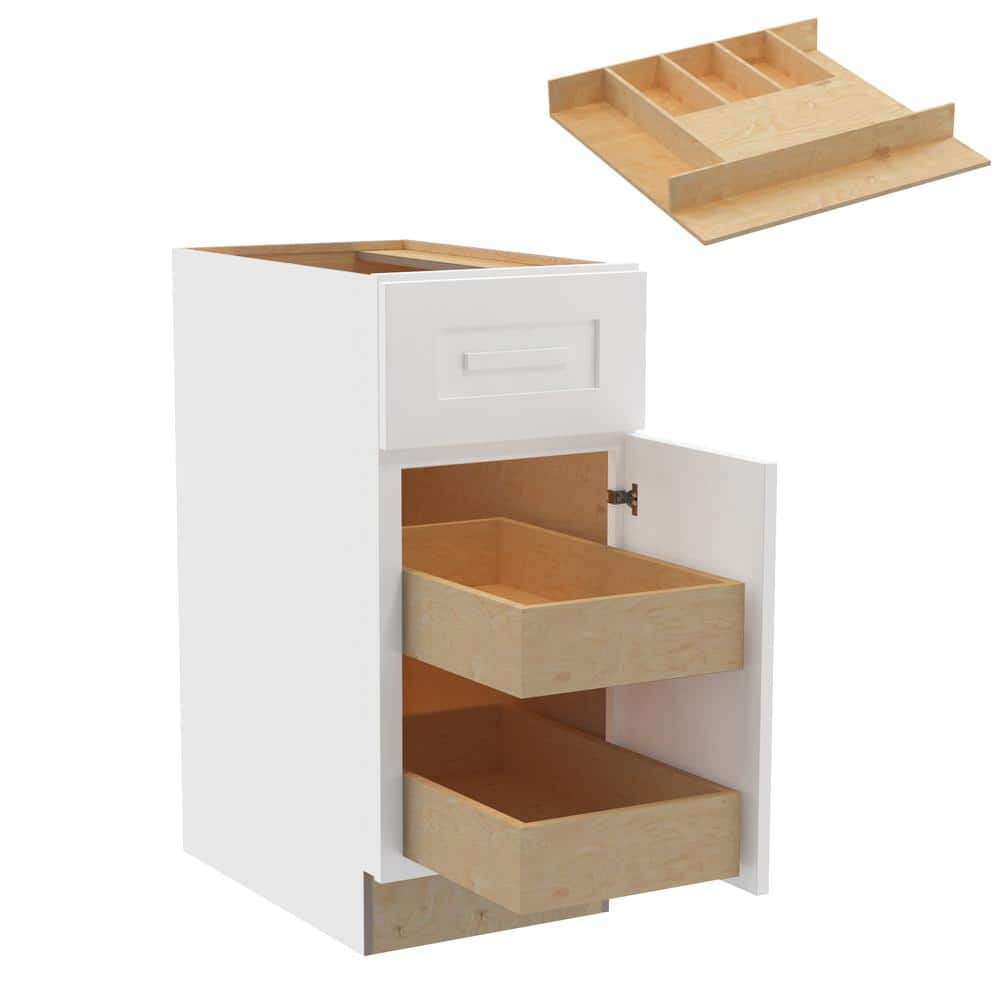 The Grayson Base Kitchen Cabinet by Home Decorators Collection combines durable plywood construction with a sleek Pacific White finish. Featuring soft-close technology and organized storage solutions, this cabinet is perfect for enhancing both functionality and style in your kitchen.