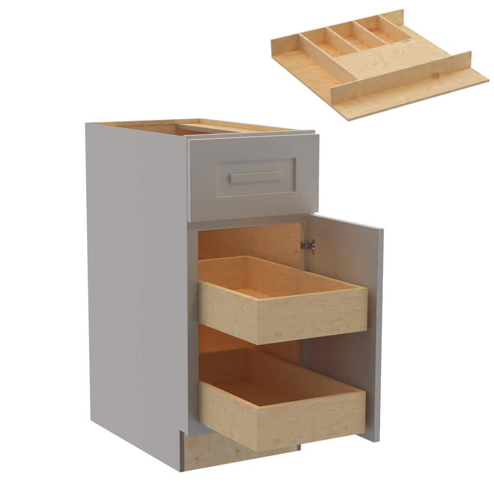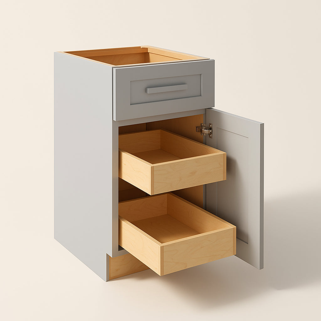 The Grayson Pearl Gray Base Kitchen Cabinet combines elegant shaker design with durable plywood construction. Featuring soft-close technology and functional storage solutions, it enhances both style and efficiency in your kitchen.