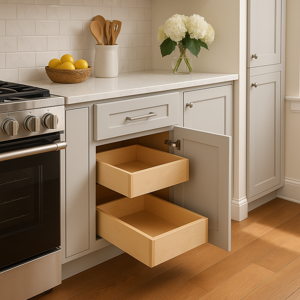 A: Yes, the soft-close roll-out trays have a capacity of up to 90 lbs, making them suitable for heavy kitchenware.
