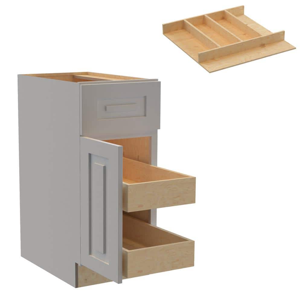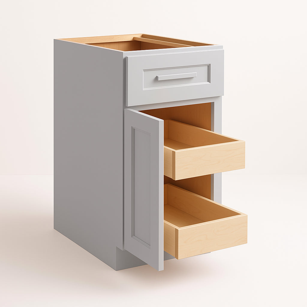 The Grayson Pearl Gray Base Kitchen Cabinet combines durable plywood construction with a soft gray painted finish, offering both style and functionality. Featuring soft-close doors and roll-out trays, it provides elegant storage while enhancing your kitchen's aesthetic.