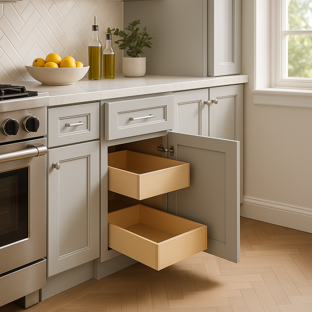 A: Each soft close roll-out tray can hold up to 90 lbs, making them perfect for storing heavy kitchen items and ensuring ease of access.