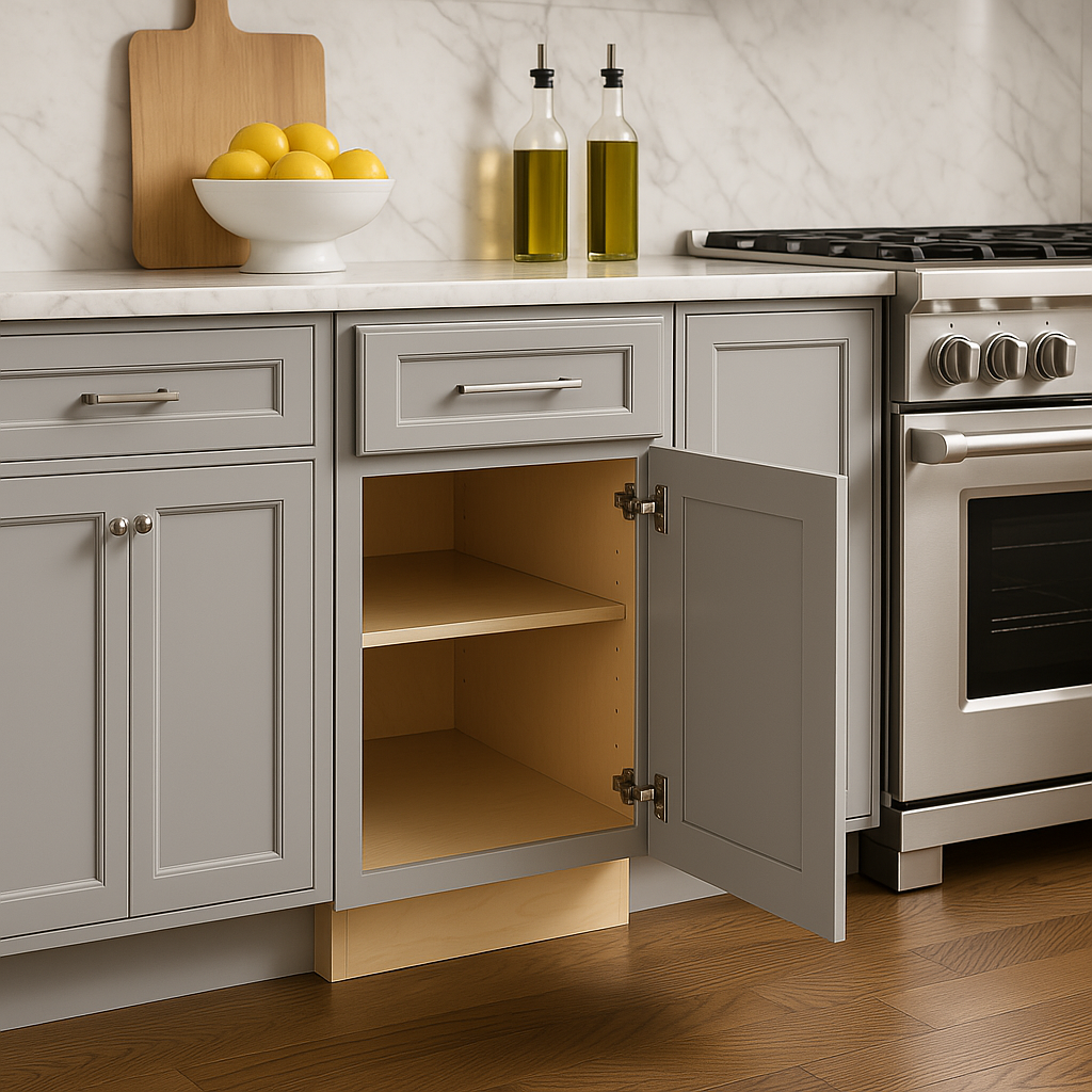 The Grayson Pearl Gray Base Kitchen Cabinet combines timeless shaker style with durable plywood construction and a soft-close mechanism for quiet, smooth operation. Its pearl gray finish adds a touch of elegance to any kitchen.